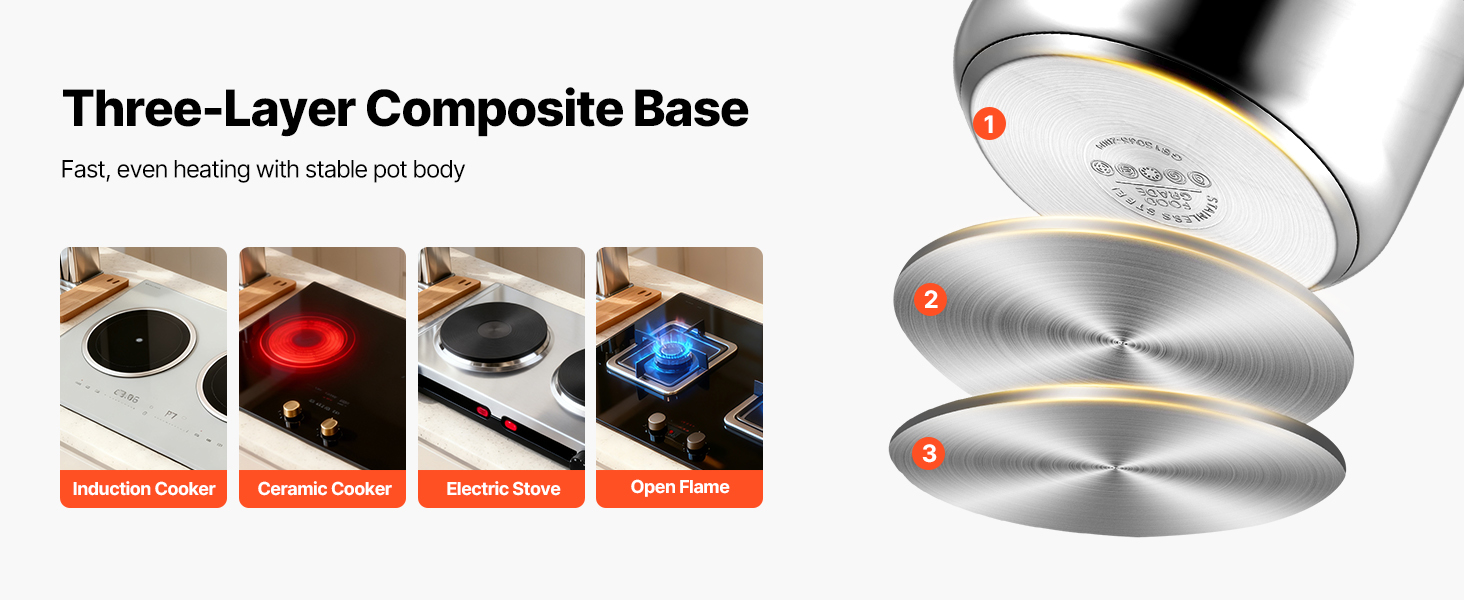 Tlakový hrniec s trojvrstvovým dnom zabezpečuje rýchle a rovnomerné zahrievanie, ktoré pomáha obmedziť pripálenie počas používania. Je kompatibilný s indukčnými, keramickými, elektrickými a plynovými varnými doskami, čím vám poskytuje flexibilné možnosti varenia a zároveň pomáha znížiť spotrebu energie a čas strávený v kuchyni.