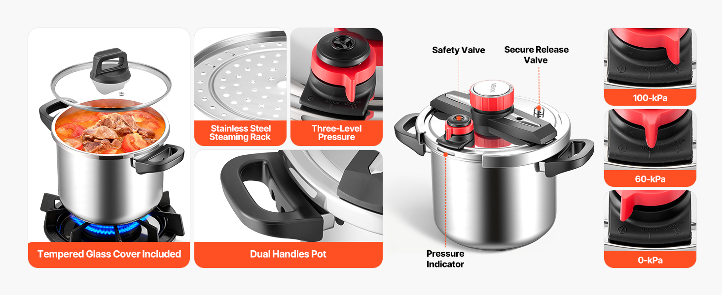 Tlakový hrniec je vyrobený z nehrdzavejúcej ocele a má zrkadlový povrch, ktorý pomáha ľahko opláchnuť zvyšky jedla. Jeho gombík na uzamknutie umožňuje hladké otváranie jednou rukou a postupná uzamykateľná konštrukcia s mäkkou ergonomickou rukoväťou ponúka stabilné a pohodlné ovládanie pri každodennom varení.