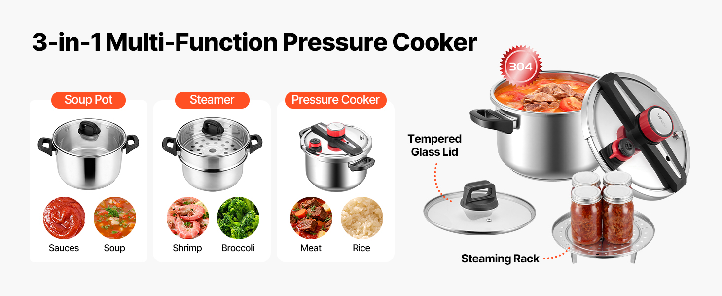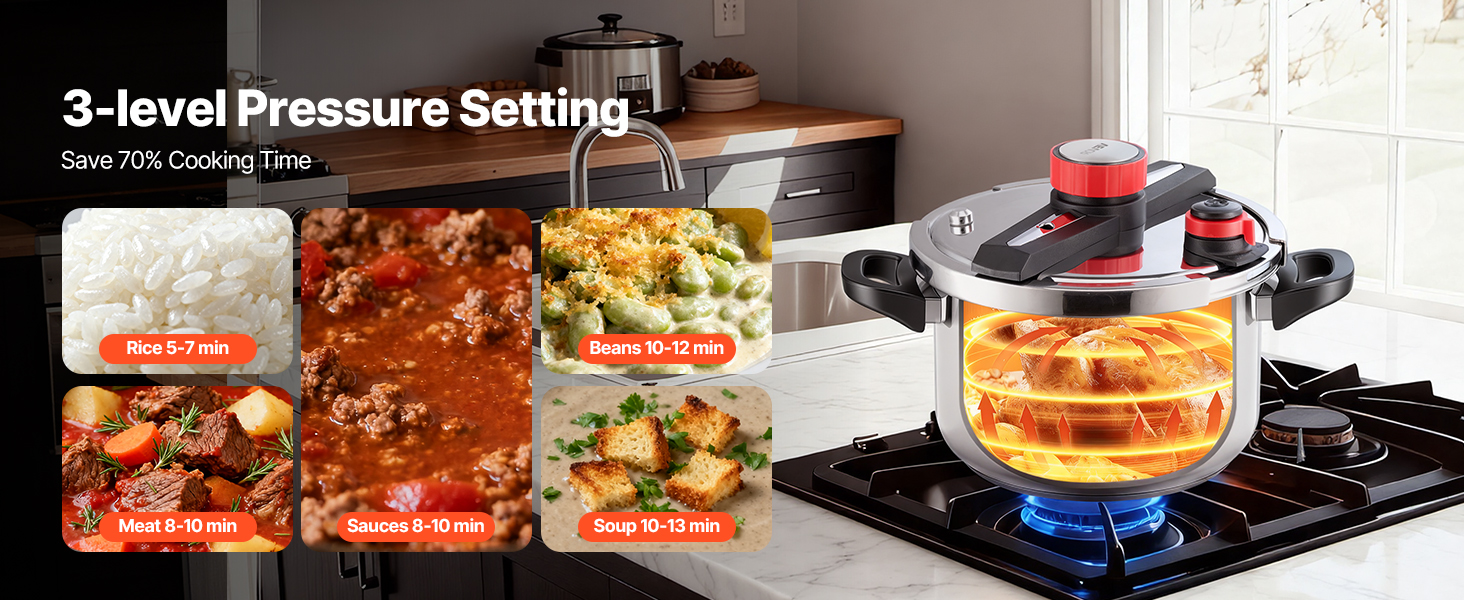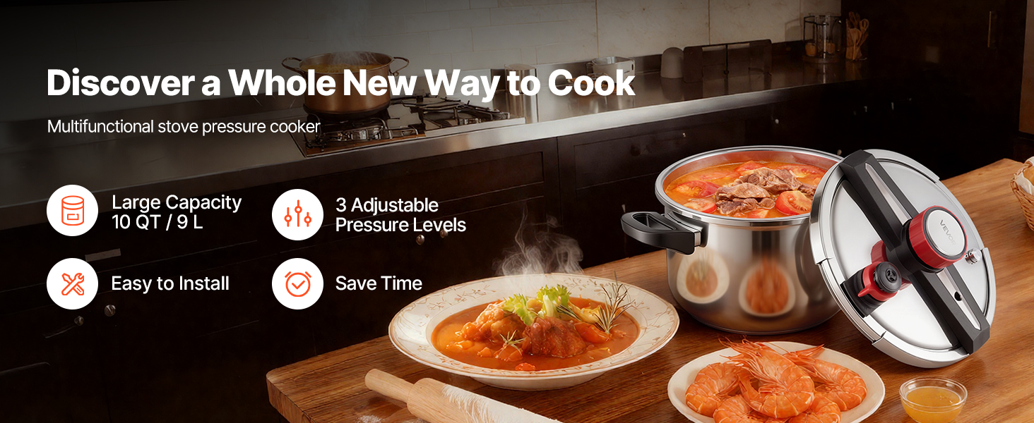 Tlakový hrniec VEVOR prináša rýchlosť, farbu a hlbokú chuť do vašej kuchyne tým, že rýchlo uzavrie prirodzenú chuť. Vyniká pri príprave vývarov, jemných rýb a výdatných dusených jedál, čím vám poskytuje nástroj, ktorý udržuje čas strávený pri jedle efektívny, príjemný a ľahko zvládnuteľný každý deň.