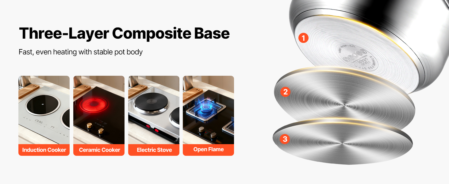 Tlakový hrniec s trojvrstvovým dnom zabezpečuje rýchle a rovnomerné zahrievanie, ktoré pomáha obmedziť pripálenie počas používania. Je kompatibilný s indukčnými, keramickými, elektrickými a plynovými varnými doskami, čím vám poskytuje flexibilné možnosti varenia a zároveň pomáha znižovať spotrebu energie a čas strávený v kuchyni.