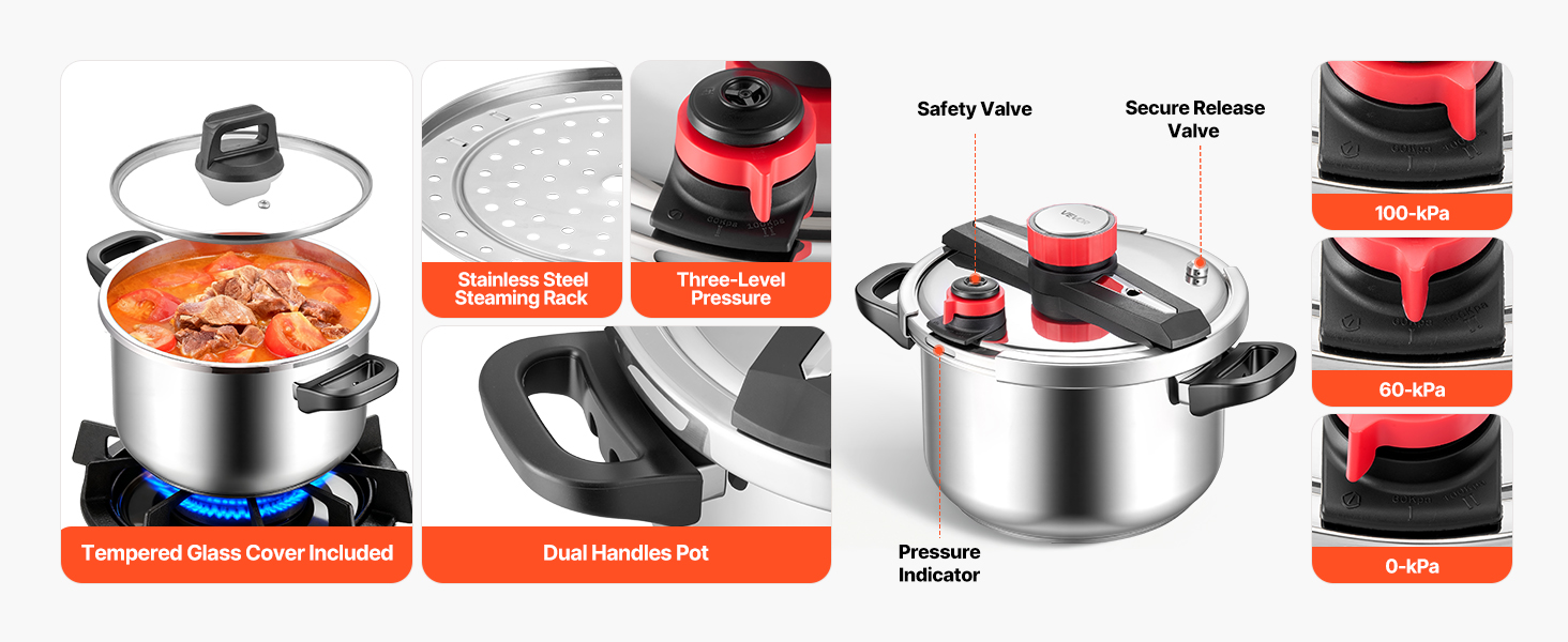 S tlakom 100 kPa pomáha tlakový hrniec s objemom 10 Qt/9 l zachovať chuť a dosiahnuť bohaté výsledky za približne 10 minút, pričom jedlá zostávajú svieže a lákavé. Jeho trojvrstvová základňa sa hodí na viacero typov sporákov a prepínanie medzi varením v pare, dusením alebo varením na miernom ohni je jednoduché vďaka jedinému gombíku pre rýchle použitie.