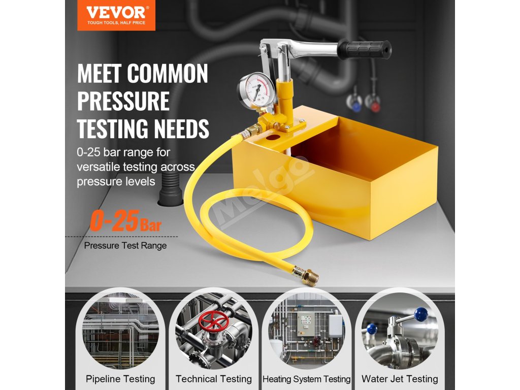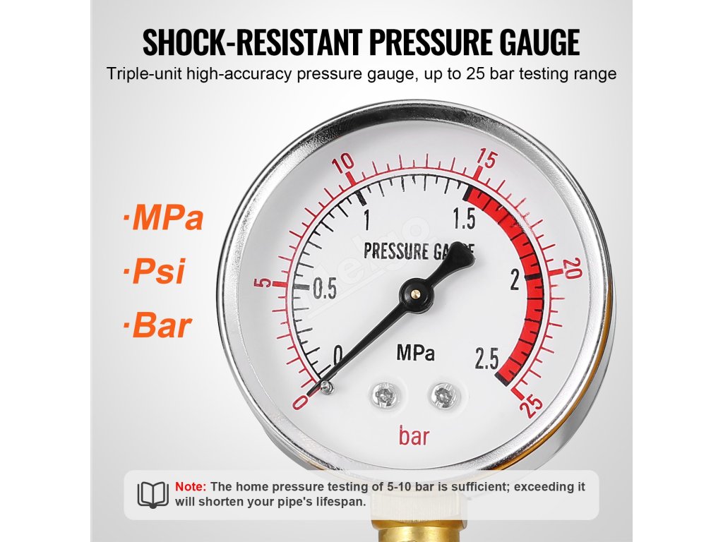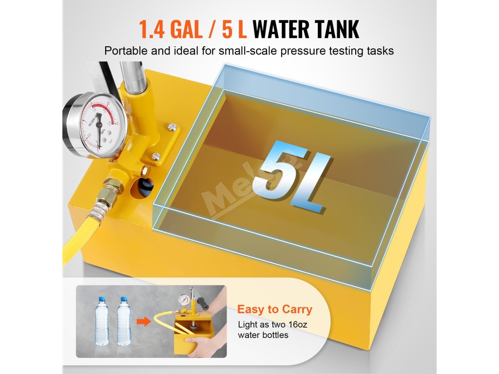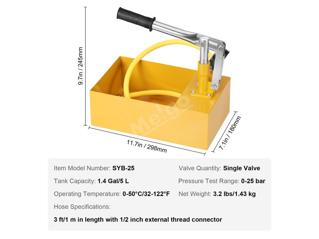 Naše hydrostatické skúšobné čerpadlo je vyrobené z robustného kovu s ergonomickou rukoväťou a robustnou hadicou. Vďaka trojjedinému manometru, systému s jedným ventilom a 1,4-galónovej (5-litrovej) nádrži na vodu poskytuje presné merania až do 25 barov/2,5 MPa. Upgradujte na tlakové skúšky bez námahy ešte dnes!