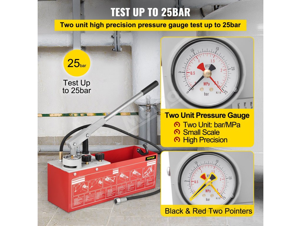 Naše tlakové skúšobné čerpadlo, ktoré testuje až do 25 barov/2,5 MPa, je vhodné pre širokú škálu aplikácií. Manometer zobrazuje hodnoty tlaku s dvoma jednotkami a vysokou presnosťou.