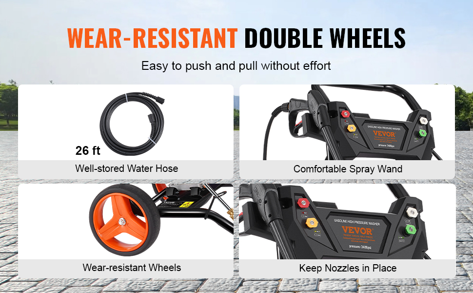Tento benzínový motorový čistič sa dodáva s robustným kovovým vozíkom s dvoma kolieskami a mäkkou rukoväťou na ľahkú mobilitu.