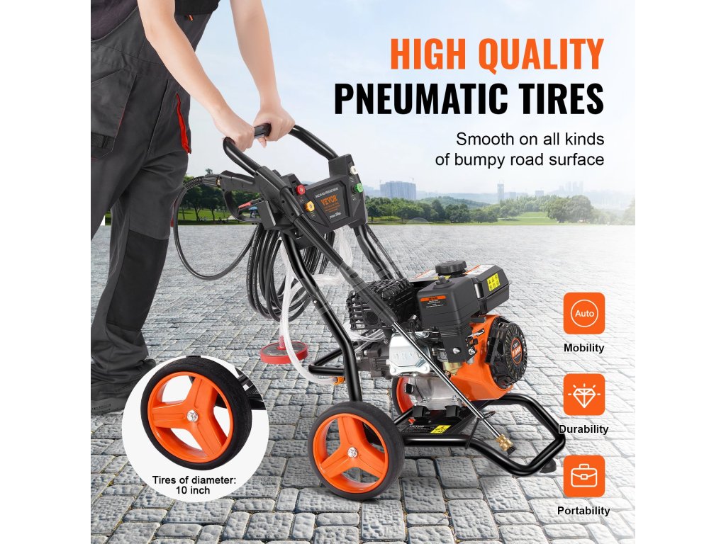 Tento benzínový motorový čistič sa dodáva s robustným kovovým vozíkom s dvoma kolieskami a mäkkou rukoväťou na ľahkú mobilitu.