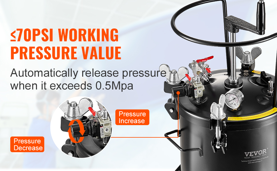 Používajte s vlastným vzduchovým kompresorom. Tlakový hrniec pracuje v rozsahu tlaku ≤ 70 psi a je vybavený automatickým poistným ventilom, ktorý uvoľní tlak, ak prekročí 0,5 MPa, čím sa zabezpečí bezpečná prevádzka.