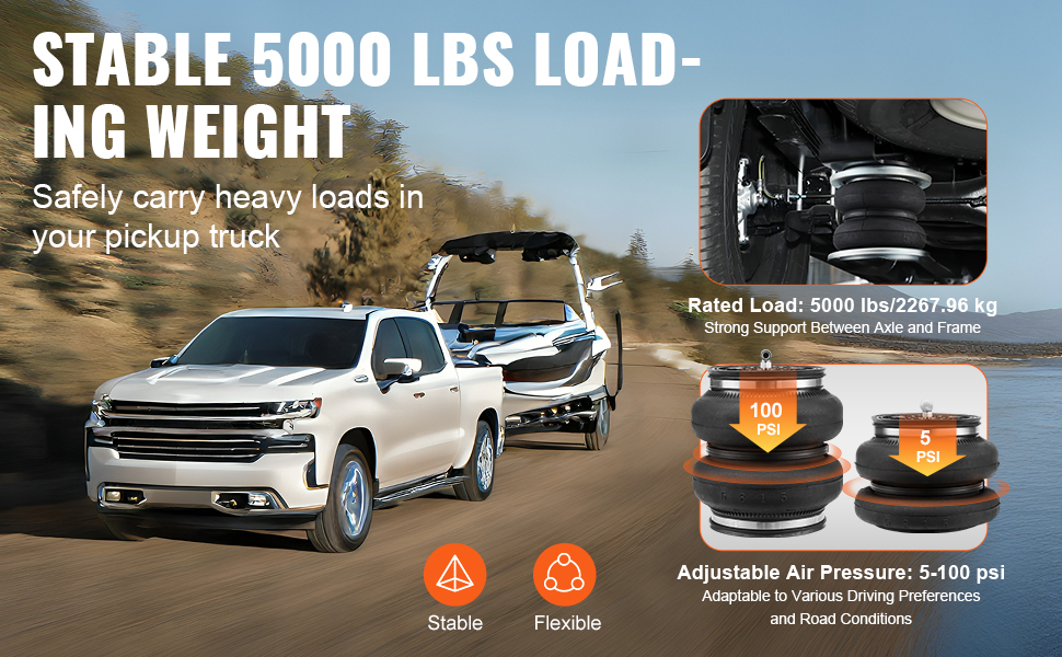 Súprava vzduchového odpruženia, ktorá dokáže uniesť až 5 000 kg, poskytuje oporu nápravy k rámu, čím znižuje prepadávanie dna. Pružné vzduchové pružiny pracujú v rozsahu 5 až 100 psi.