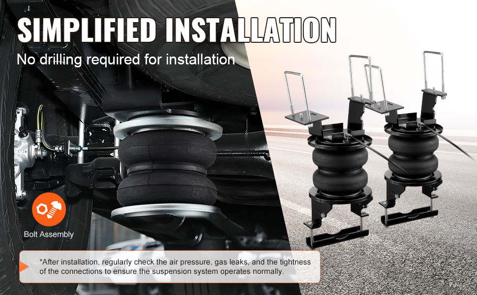 Pri inštalácii vzduchových vakov pruženia postupujte podľa podrobných pokynov bez potreby dodatočného vŕtania alebo úprav, čo zjednodušuje proces inštalácie.