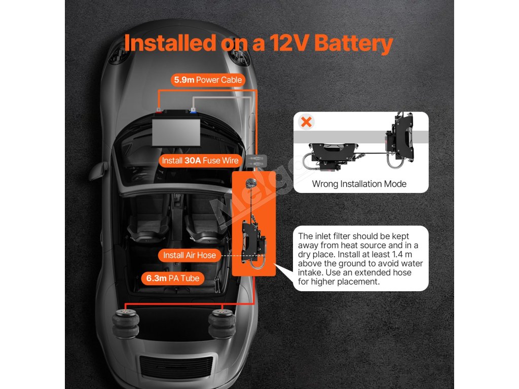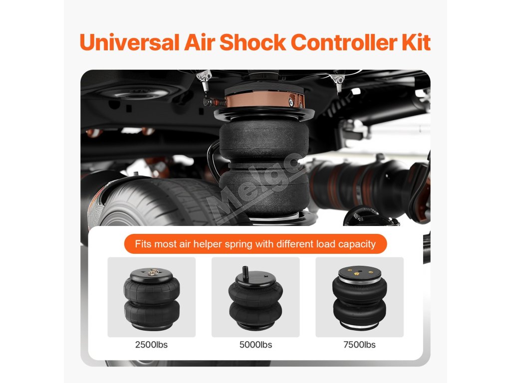 Súprava kompresora vzduchových tlmičov je vybavená univerzálnymi konektormi a je kompatibilná s väčšinou systémov vzduchového odpruženia. Možno ju široko použiť na rôzne typy vozidiel a značky. Pri inštalácii dbajte na to, aby boli hadice a káble vzdialené aspoň 6 cm od akéhokoľvek zdroja tepla.