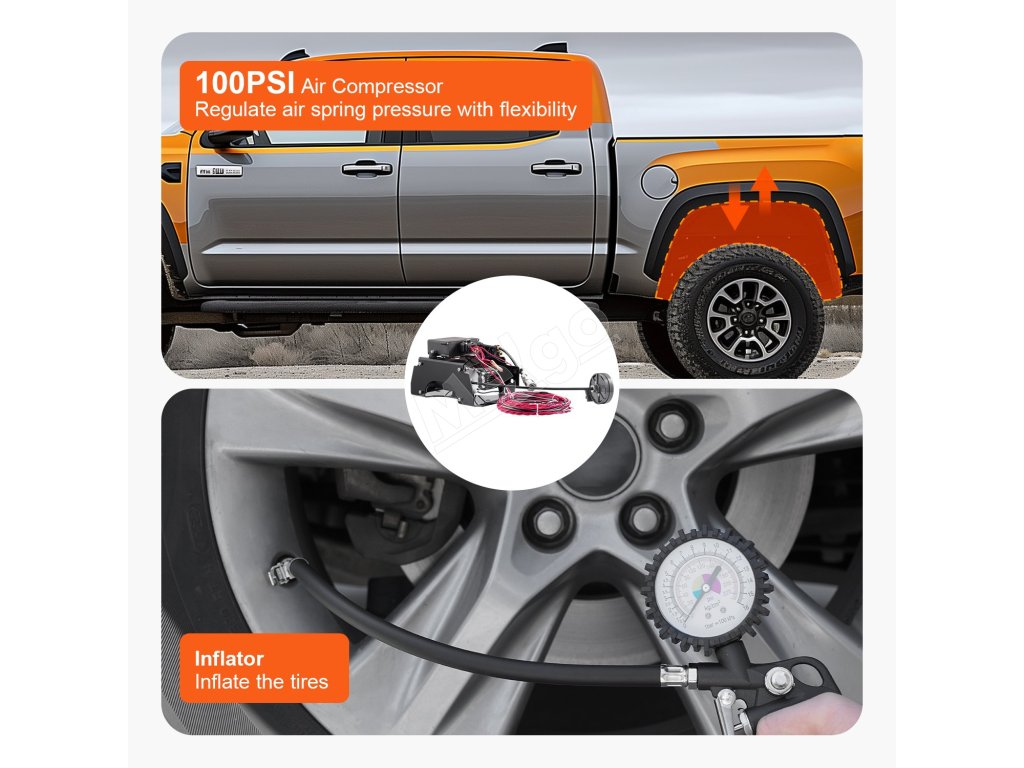 Tento palubný vzduchový kompresorový systém sa dodáva s kompresorom s výkonom až 100 psi, ktorý rýchlo nafukuje. Je kompatibilný s väčšinou systémov vzduchového odpruženia, takže je ideálny na inštaláciu do rôznych typov vozidiel a značiek.