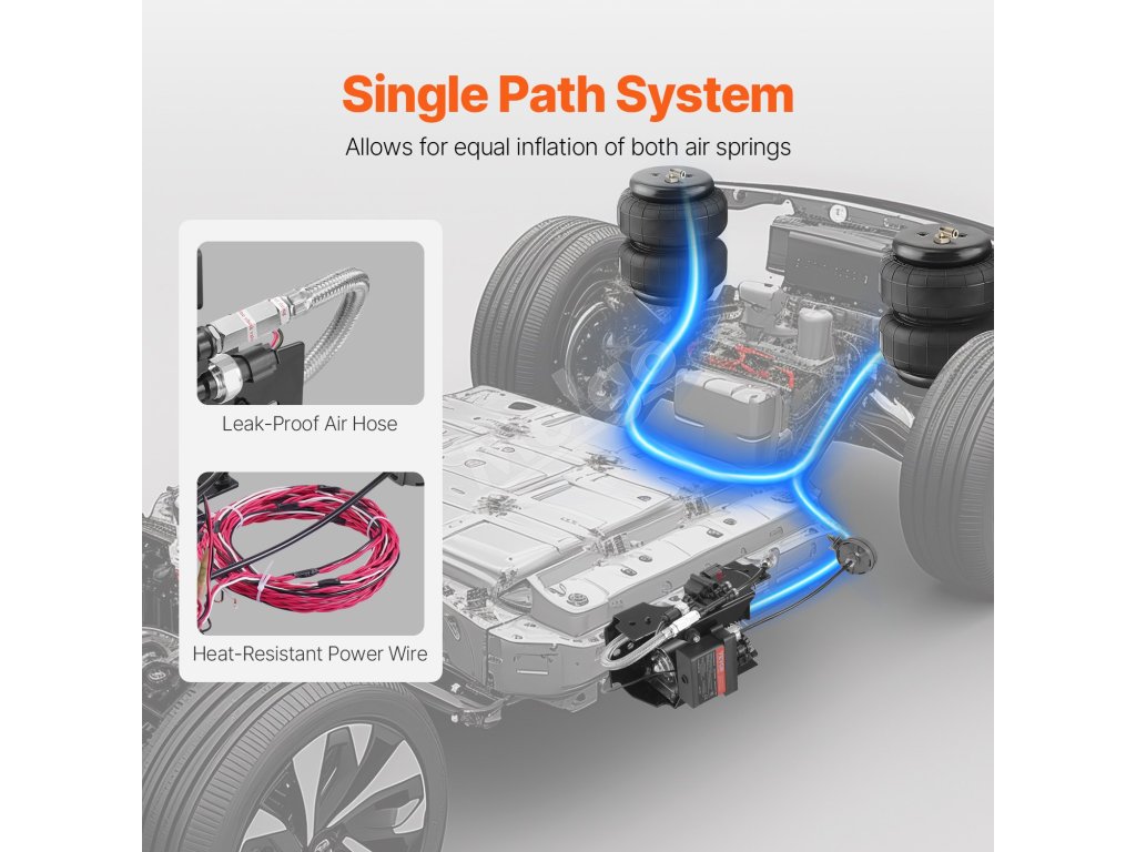 Táto kompresorová súprava vzduchového odpruženia ponúka tlak až 100 PSI, ideálny pre rôzne vozidlá. Nastavte odpruženie prostredníctvom mobilnej aplikácie alebo diaľkového ovládania pre plynulú jazdu. Systém s jednou dráhou rovnomerne rozdeľuje tlak vzduchu, čím zabezpečuje pohodlie pri ťahaní alebo prevážaní ťažkých nákladov.