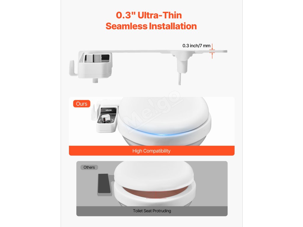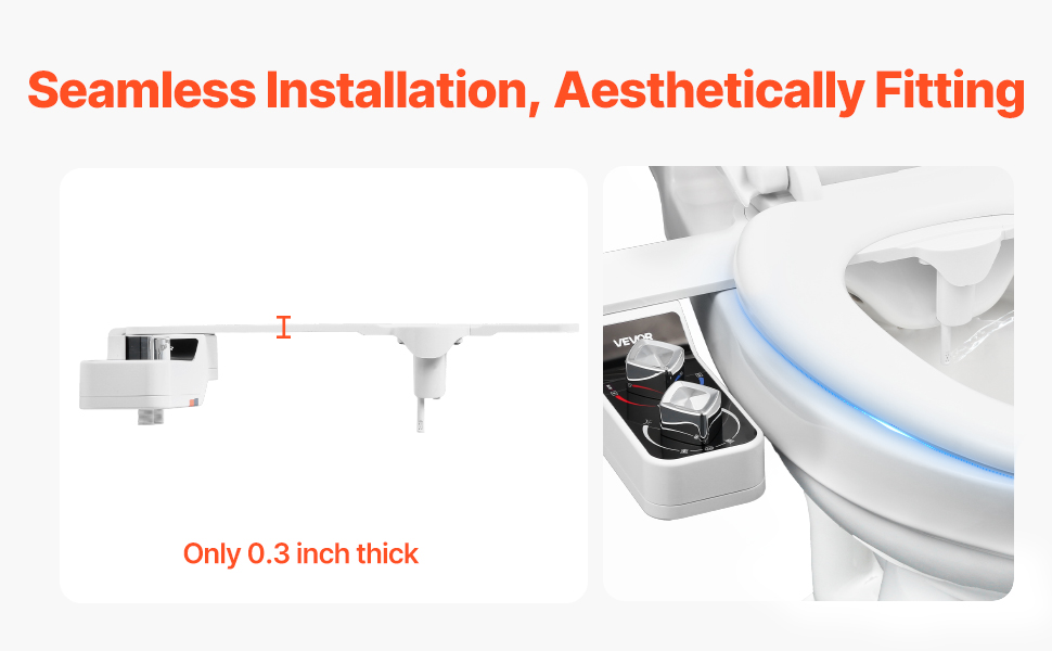 Tento bidetový nadstavec na toaletu má elegantný 0,3-palcový ultratenký profil, ktorý sa zmestí do jednej roviny s vaším záchodovým sedadlom. Žiadne nepríjemné medzery - len elegantné, moderné vylepšenie, ktoré krásne zapadne do každej kúpeľne.