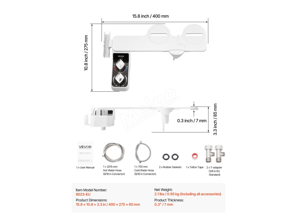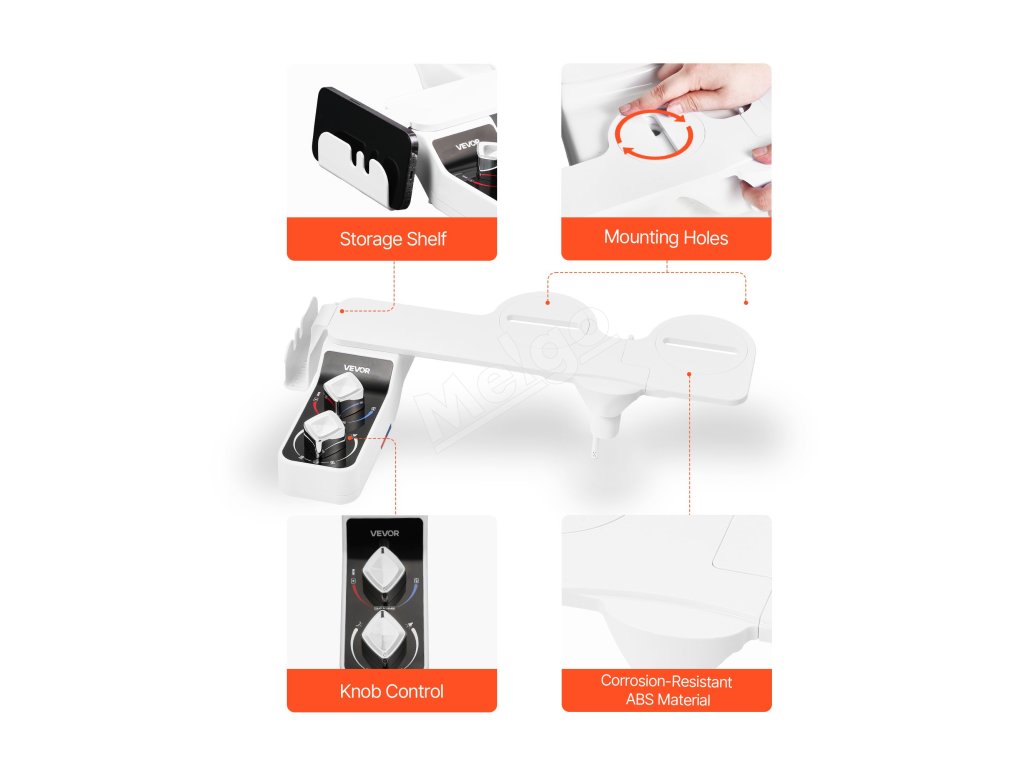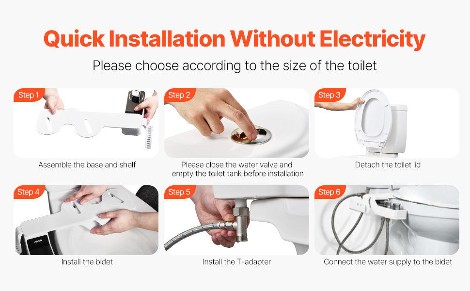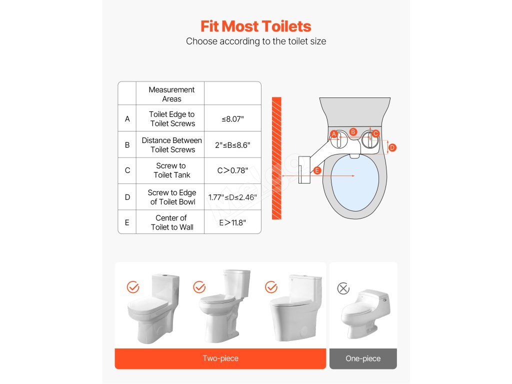 Tento bidetový nadstavec na záchodové sedadlo sa ľahko inštaluje - nie je potrebná žiadna elektrina, žiadne špeciálne nástroje ani inštalatér. Pred kúpou si len zmerajte svoju toaletu. Tip: Vyhnite sa prílišnému utiahnutiu skrutiek sedadla, aby ste bidet udržali vo vodorovnej polohe.