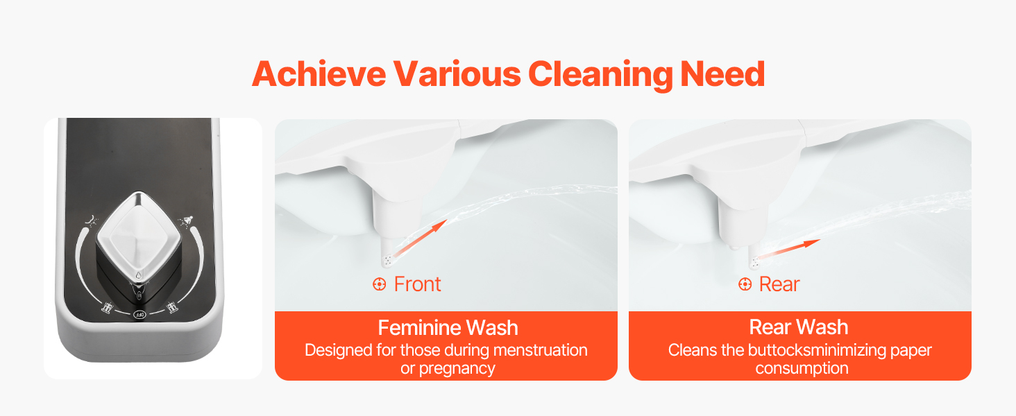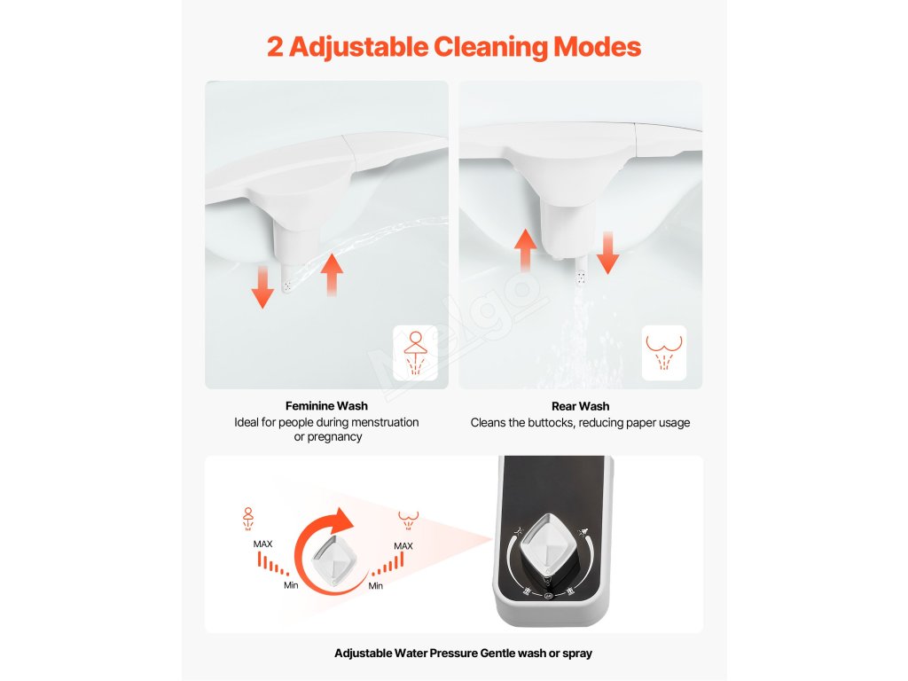 Tento bidetový nástavec na WC je vybavený dvoma tryskami na predné a zadné umývanie. Ženský režim ponúka jemnú starostlivosť, ideálnu pre osoby počas menštruácie alebo tehotenstva