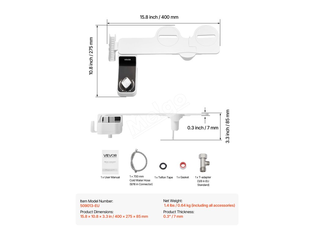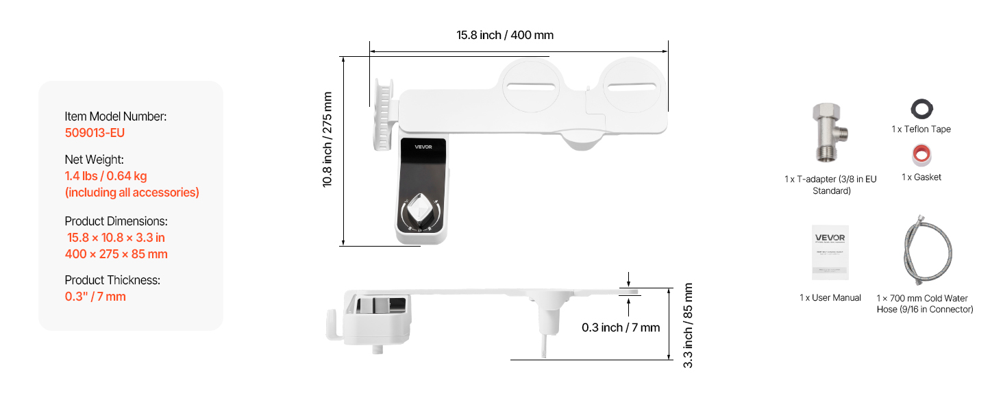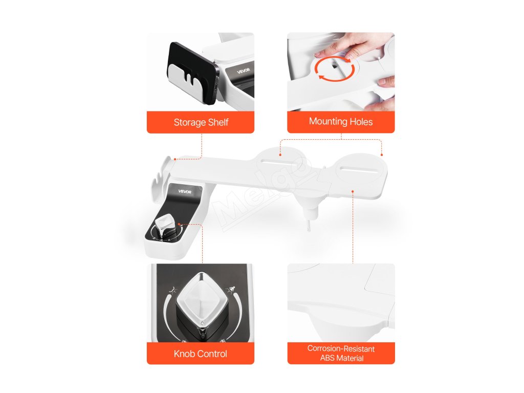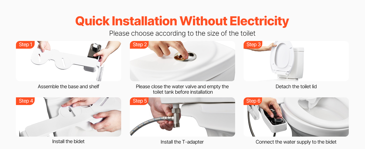 Tento bidetový nadstavec na záchodové sedadlo sa ľahko inštaluje - nie je potrebná žiadna elektrina, žiadne špeciálne nástroje ani inštalatér. Pred kúpou si len zmerajte svoju toaletu. Tip: Vyhnite sa prílišnému utiahnutiu skrutiek sedadla, aby ste bidet udržali vo vodorovnej polohe.