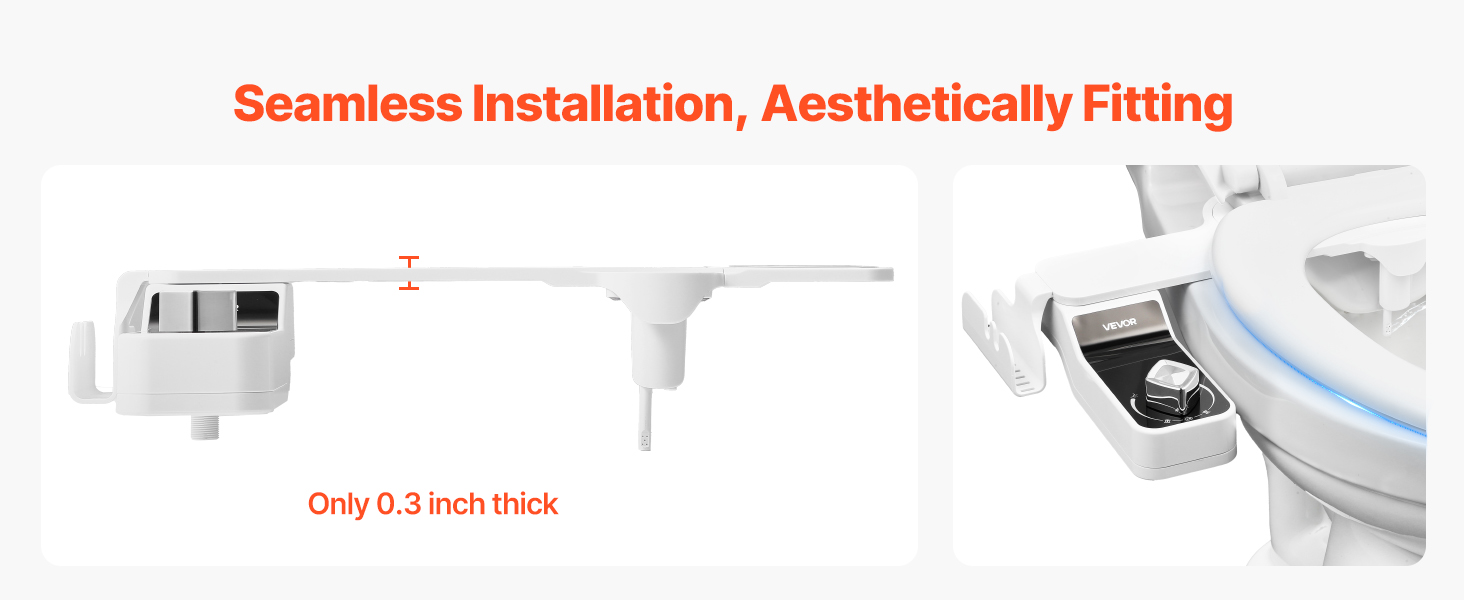 Tento bidetový nadstavec na toaletu má elegantný 0,3-palcový ultratenký profil, ktorý sa zmestí do jednej roviny s vaším záchodovým sedadlom. Žiadne nepríjemné medzery - len elegantné, moderné vylepšenie, ktoré krásne zapadne do každej kúpeľne.
