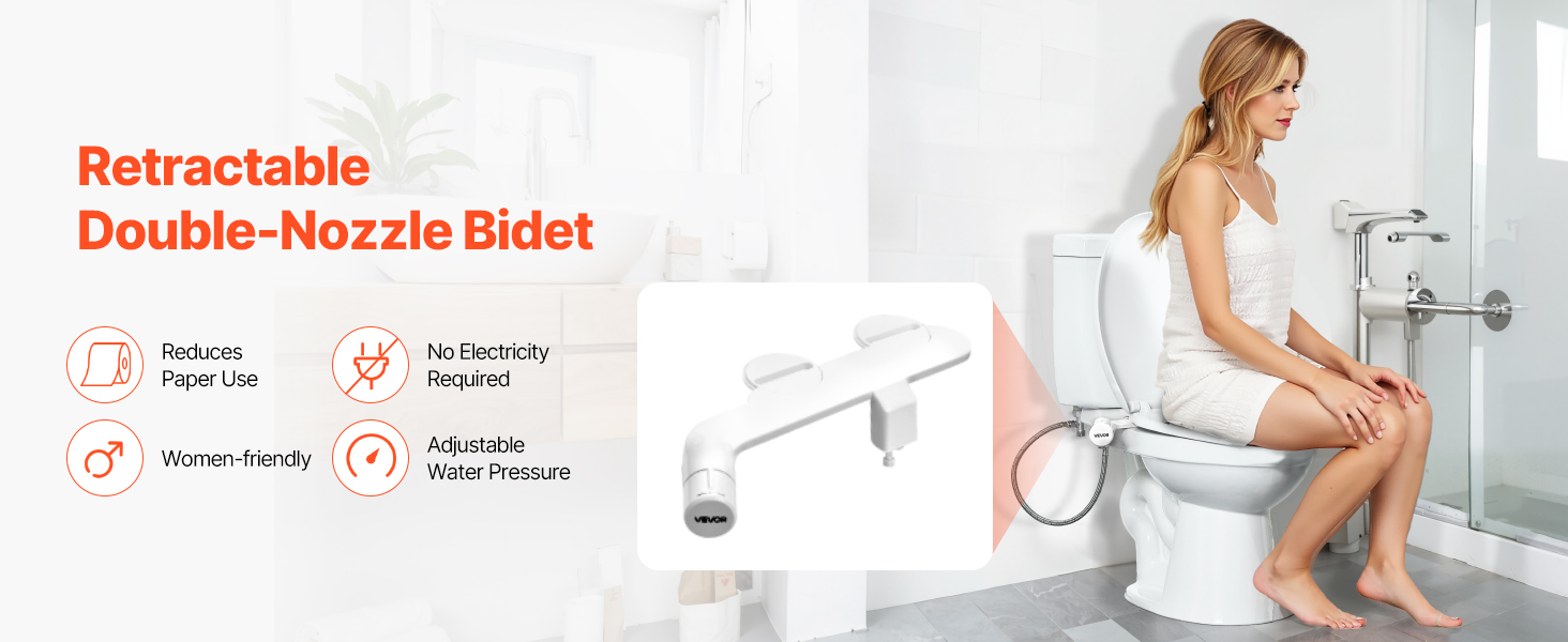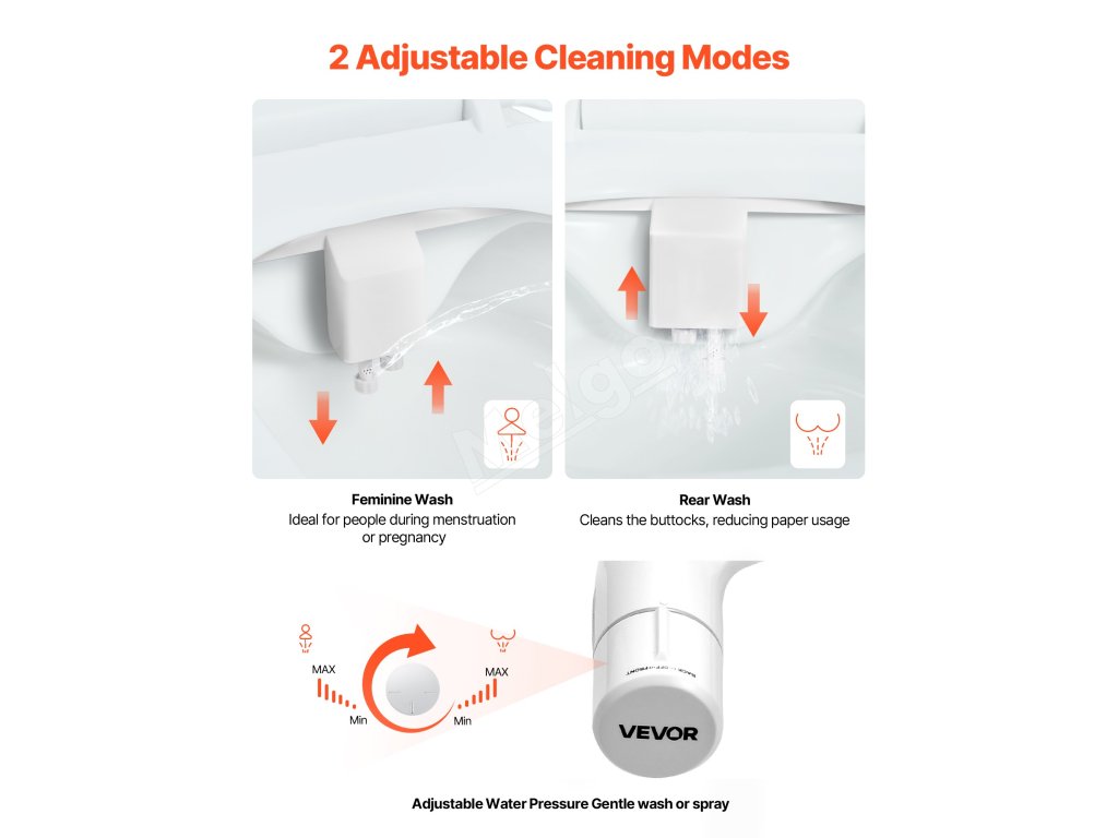 Tento bidetový nástavec na WC je vybavený dvoma tryskami na predné a zadné umývanie. Ženský režim ponúka jemnú starostlivosť, ideálnu pre osoby počas menštruácie alebo tehotenstva