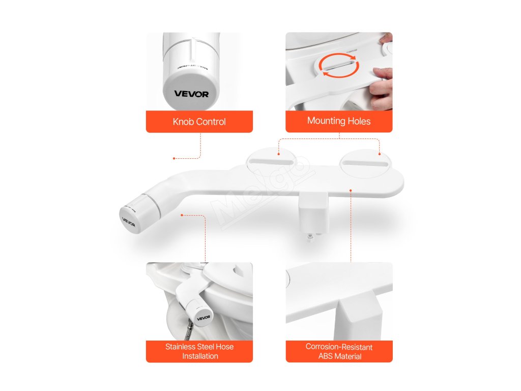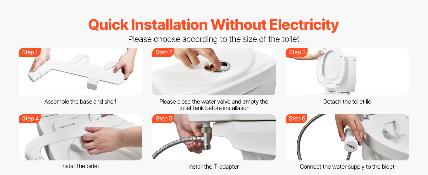 Tento bidetový nadstavec na záchodové sedadlo sa ľahko inštaluje - nie je potrebná žiadna elektrina, žiadne špeciálne nástroje ani inštalatér. Pred kúpou stačí zmerať vašu toaletu. Tip: Vyhnite sa prílišnému utiahnutiu skrutiek sedadla, aby ste bidet udržali vo vodorovnej polohe.
