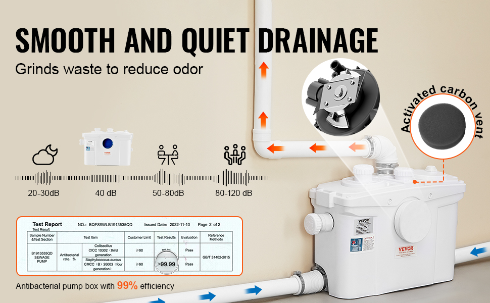 Zabudované ostré čepele rozomelú odpadovú vodu, odpad a vlasy na malé čiastočky, čím zabezpečia plynulejší systém prúdenia vody bez upchávania. Hluk vznikajúci počas procesu je dostatočne nízky na to, aby nerušil bežný spánok.