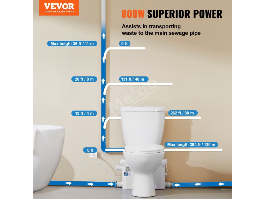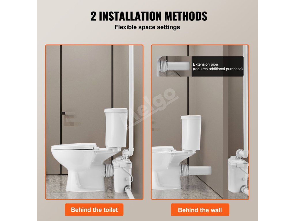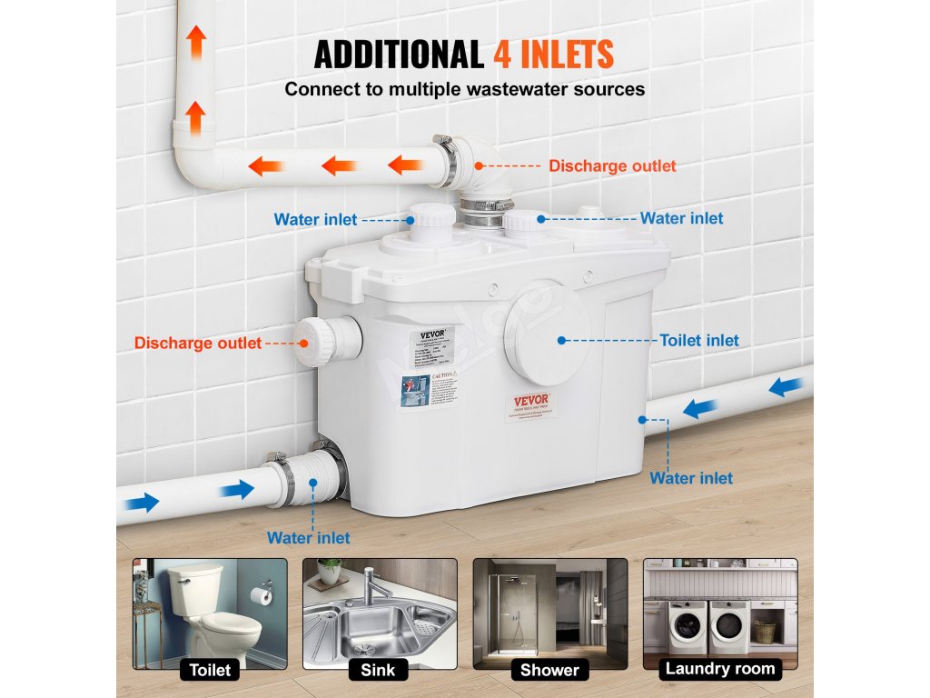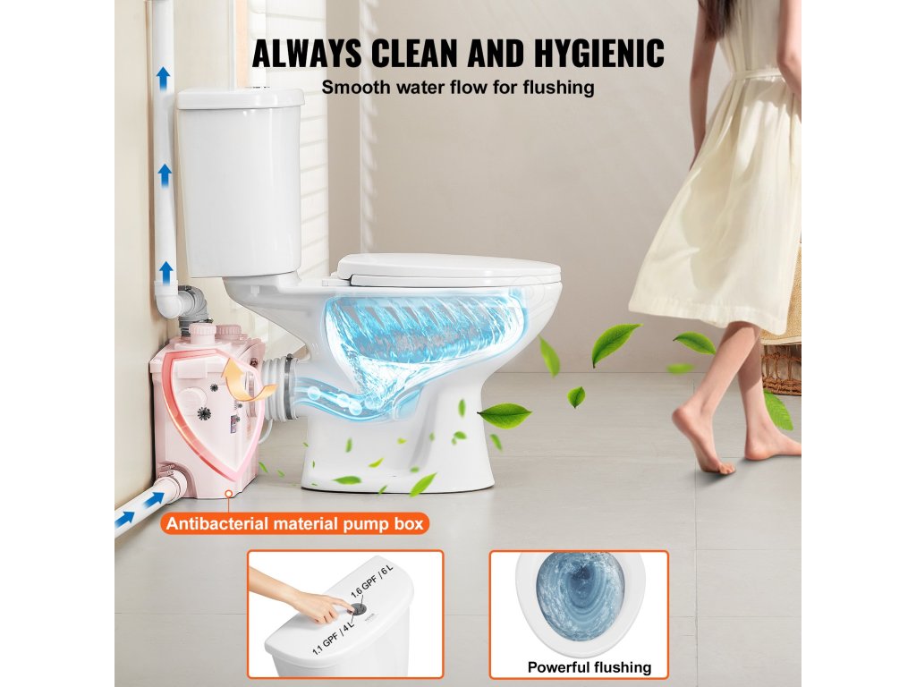 S výkonným WC čerpadlom na odsávanie a prepravu vody môžete teraz nainštalovať toaletu, sprchu alebo práčku v priestoroch, ako sú pivnice, v ktorých chýbajú prednastavené odtokové rúry, bez toho, aby ste sa museli obávať problémov s potrubím alebo konštrukciou.