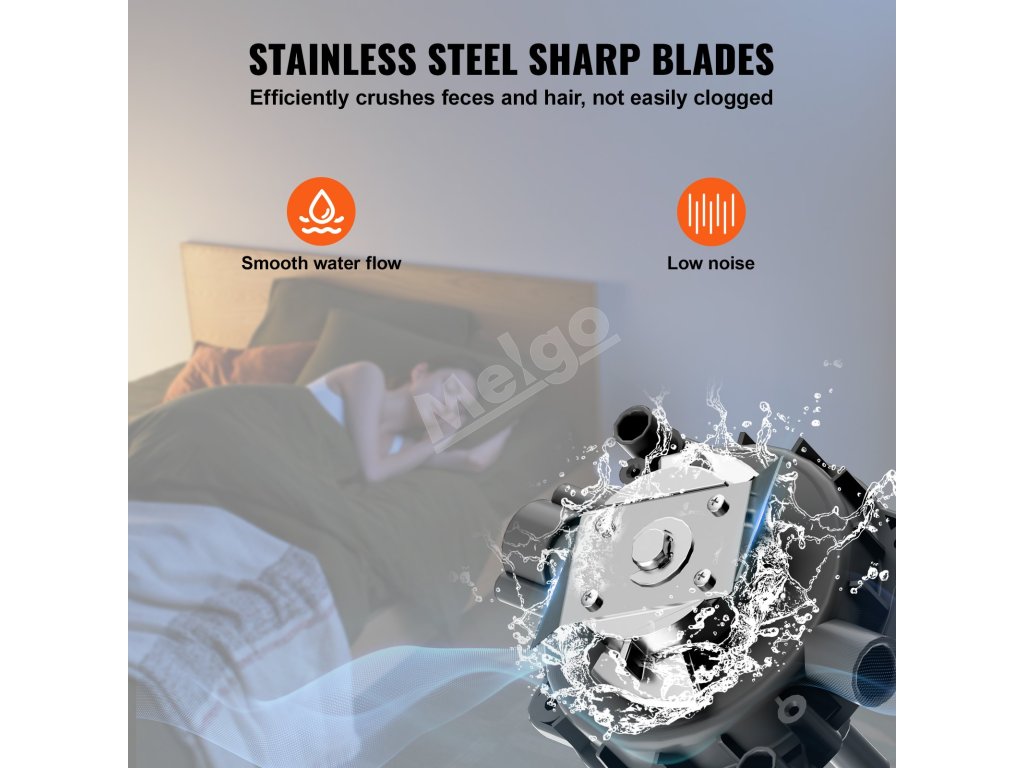 Zabudované ostré čepele rozomelú odpadovú vodu, odpad a vlasy na malé čiastočky, čím zabezpečia plynulejší systém prúdenia vody bez upchávania. Hluk vznikajúci počas procesu je dostatočne nízky na to, aby nerušil bežný spánok.