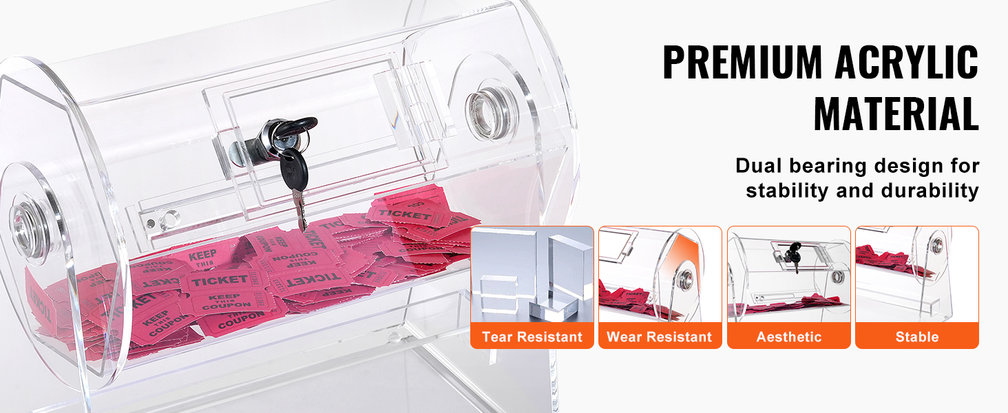 Náš bubon na tombolové lístky je vyrobený z vysokokvalitného akrylu, ktorý je známy svojou odolnosťou proti roztrhnutiu, opotrebovaniu a trvanlivosťou proti rozbitiu. Konštrukcia s dvojitým ložiskom zabezpečuje hladší a pohodlnejší priebeh tomboly a poskytuje stabilitu a rovnováhu počas žrebovania.