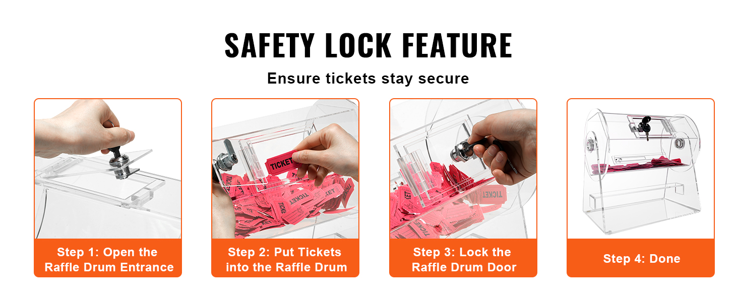 Bubon na lístky je vybavený uzatvárateľným otvorom na lístky a dvierkami, ktoré možno uzamknúť kľúčom, čím sa eliminujú obavy z náhodného vypadnutia alebo rozsypania lístkov počas žrebovania. Jeho používanie je jednoduché - stačí otvoriť dvierka, vložiť lístky, zamknúť dvierka kľúčom a spustiť tombolu.