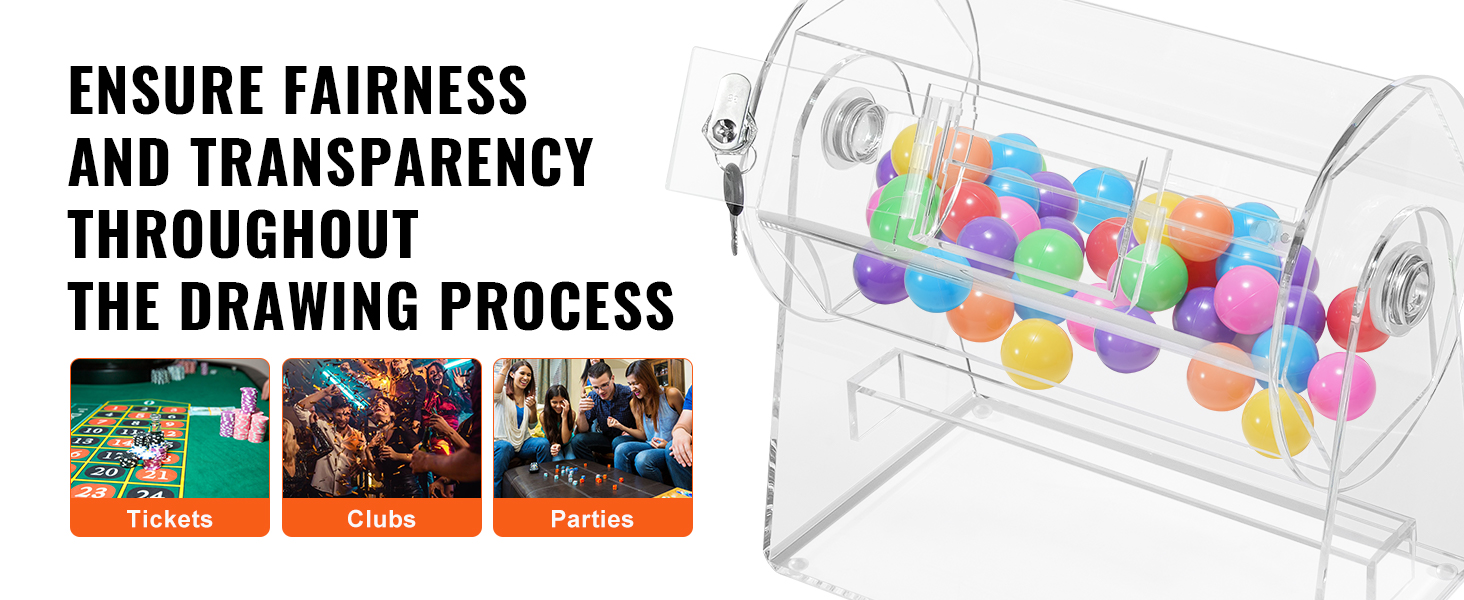 Priehľadný dizajn zabezpečuje transparentný priebeh tomboly, vďaka čomu má každý účastník rovnakú šancu byť vyžrebovaný. Lotériový bubon sa široko používa na hry bingo, hlasovanie, spoločenské stretnutia, firemné večierky, výstavy, podujatia na získavanie finančných prostriedkov a iné.