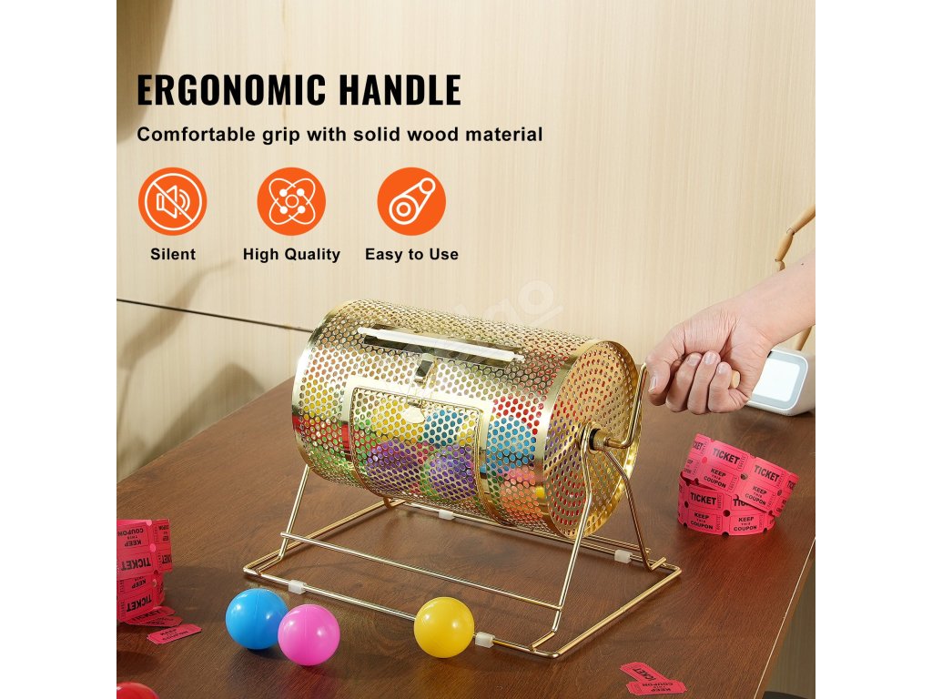 Tombolový bubon je vyrobený z odolnej ocele potiahnutej odolnou mosadznou vrstvou, ktorá zaisťuje odolnosť proti hrdzi počas dlhšieho obdobia. Konštrukcia obdĺžnikového oceľového základného rámu zabezpečuje robustnosť, zaisťuje stabilitu a rovnováhu počas bubnovania, čo uľahčuje hladší priebeh tomboly.