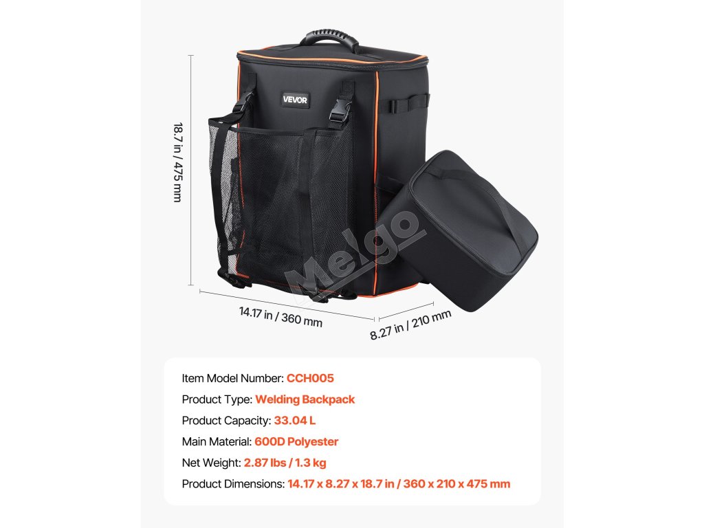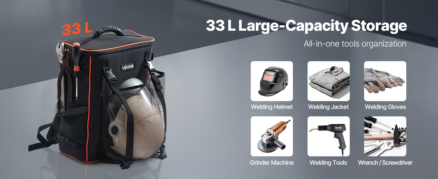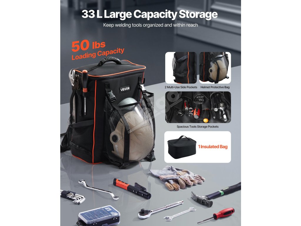 Zváračský batoh VEVOR ponúka veľkorysý objem 33 l, ktorý je ideálny na uloženie zváračského vybavenia, zváračskej prilby, zváračskej bundy, zváračských rukavíc a ďalších vecí. Súčasťou je aj prídavné izolované vrecko, ktoré udrží vaše jedlo alebo nápoje chladné v lete a teplé v zime počas niekoľkých hodín.