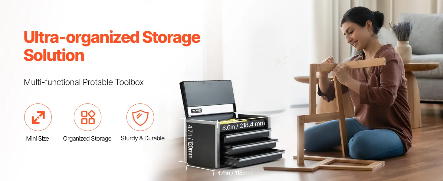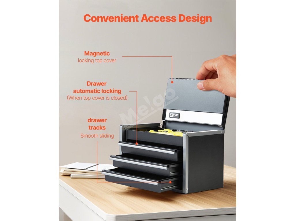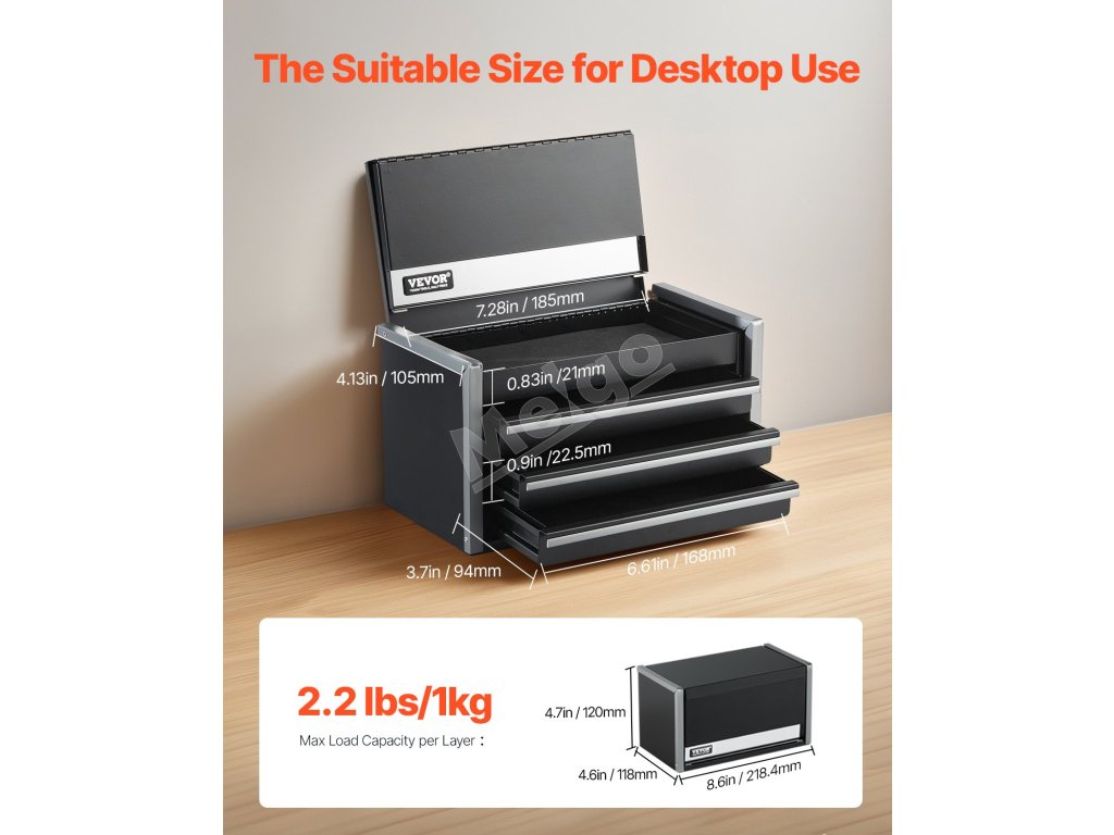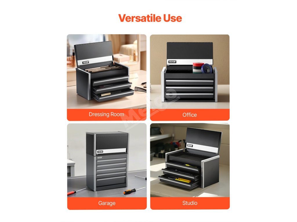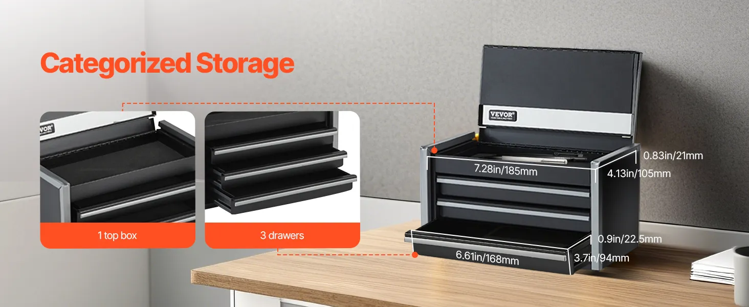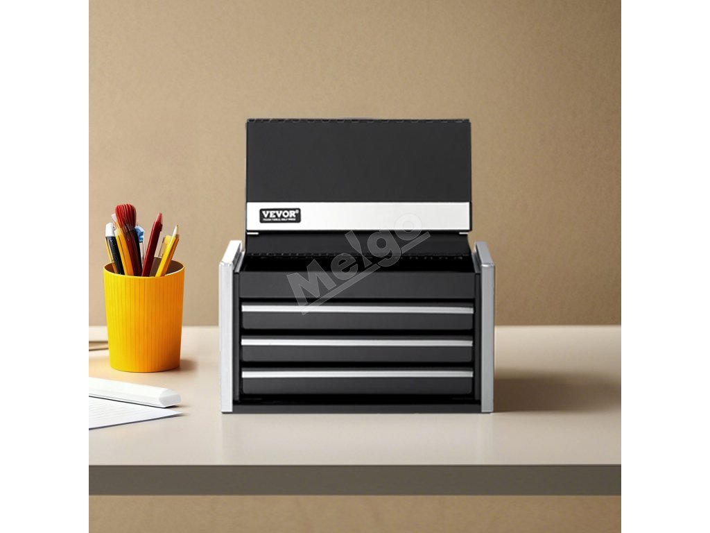 Mini kovový box na náradie obsahuje 1 hornú priehradku a 3 zásuvky, ktoré vám umožnia prehľadne kategorizovať predmety a udržiavať váš stôl uprataný a bez neporiadku.