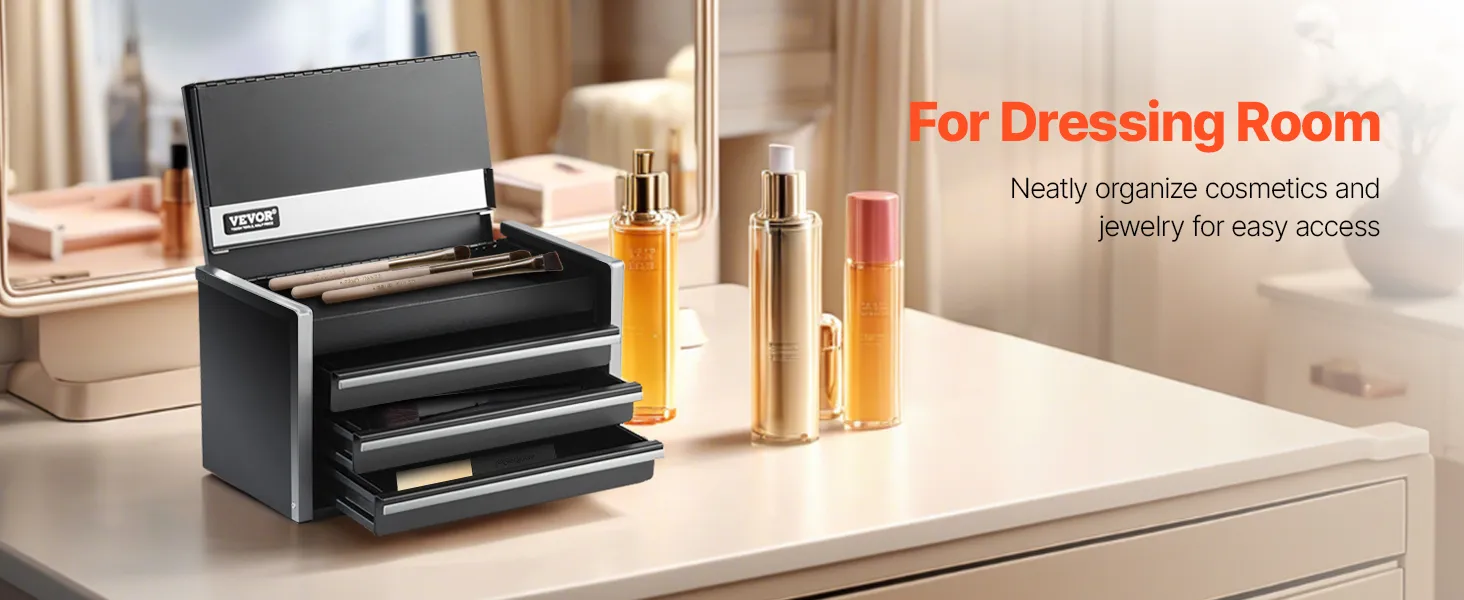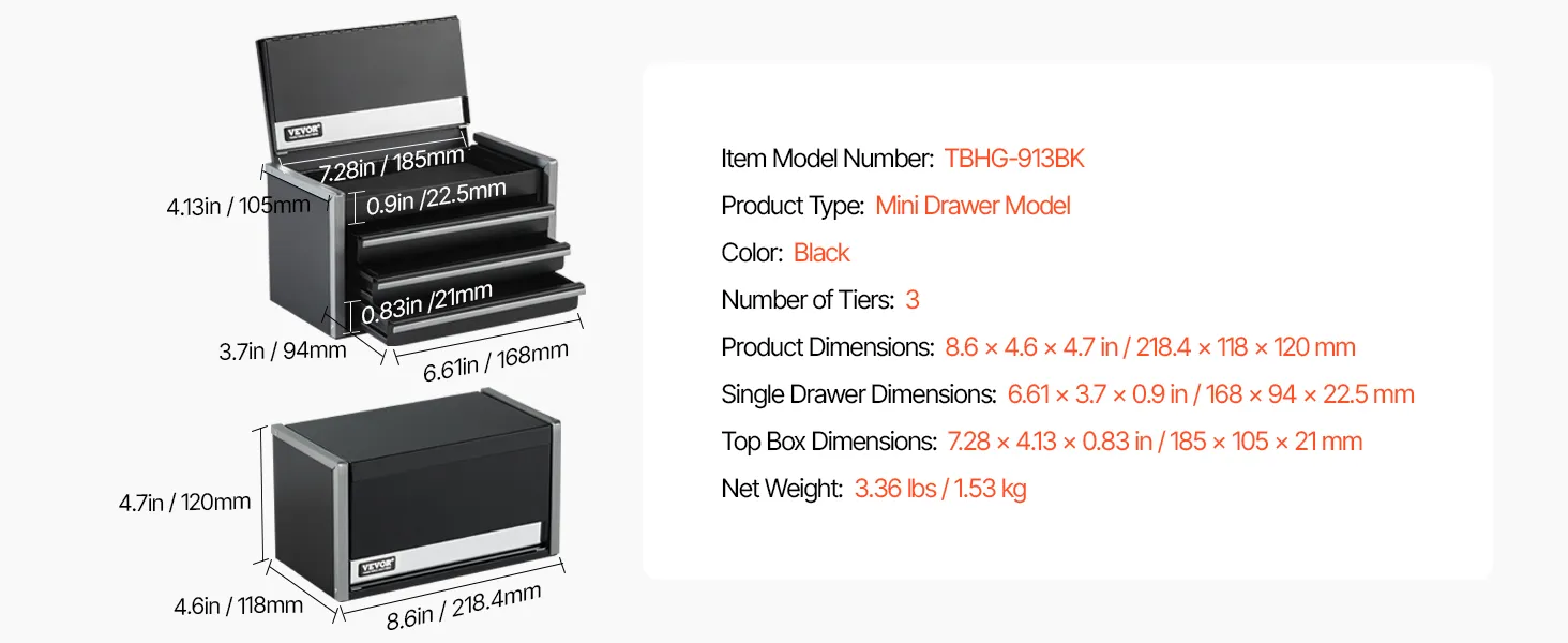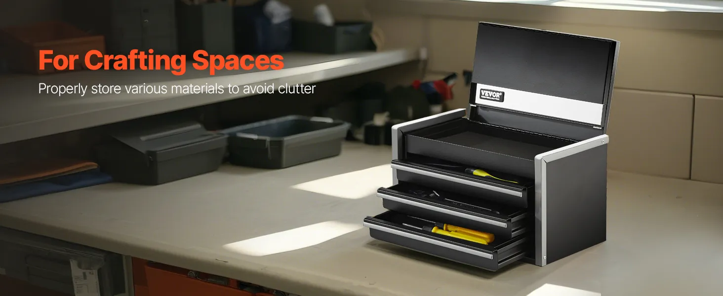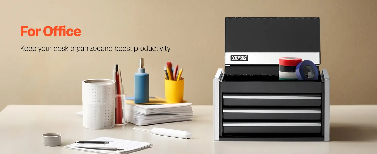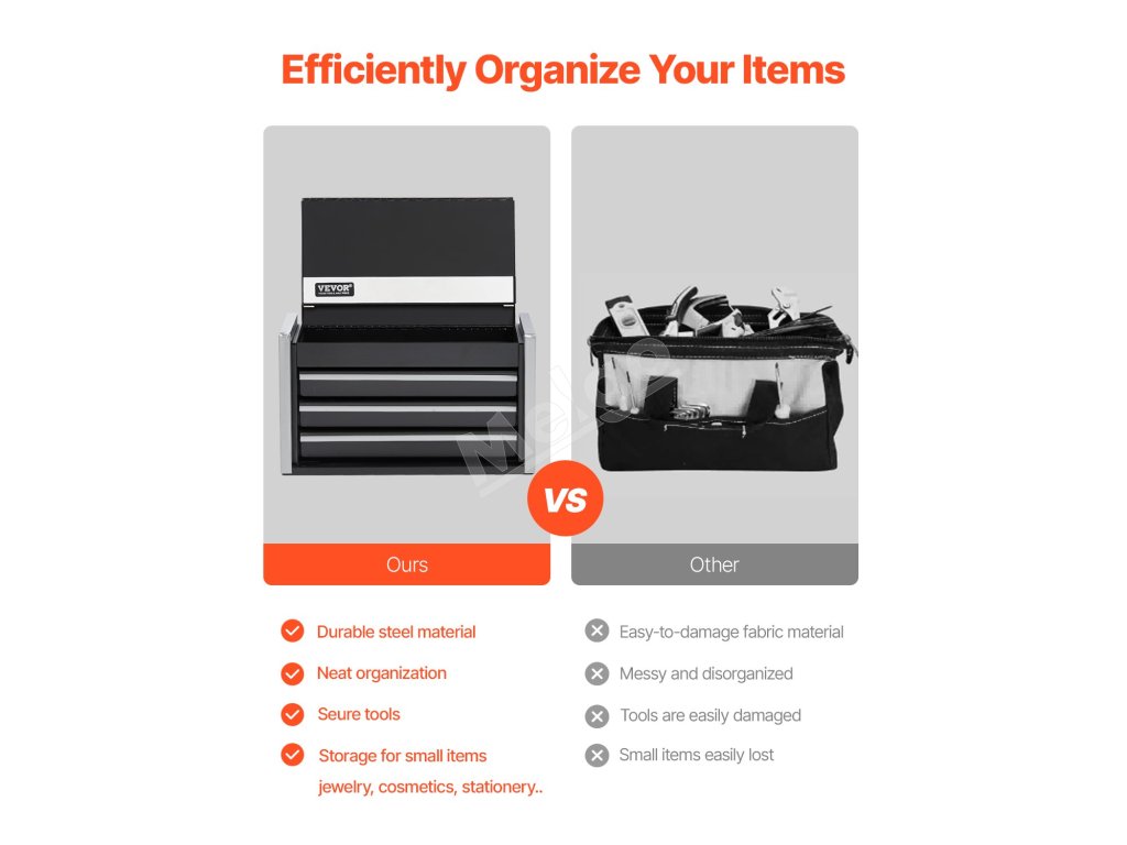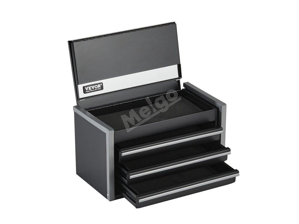 Mini kovový box na náradie obsahuje 1 hornú priehradku a 3 zásuvky, ktoré vám umožnia prehľadne kategorizovať predmety a udržiavať váš stôl uprataný a bez neporiadku.