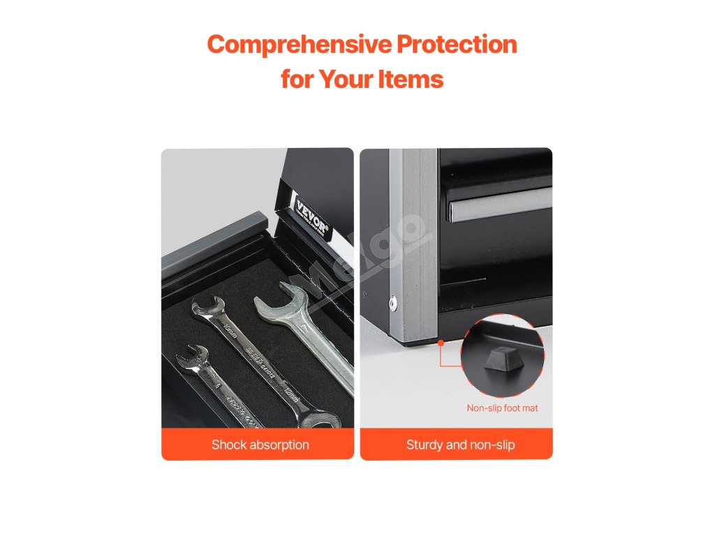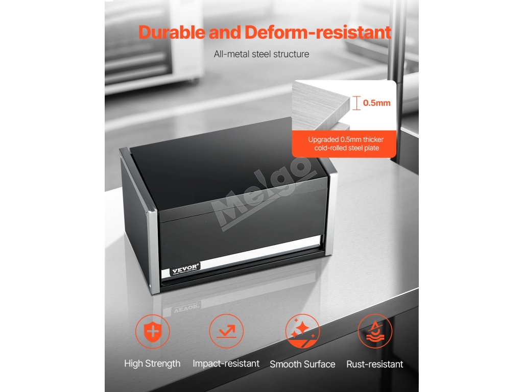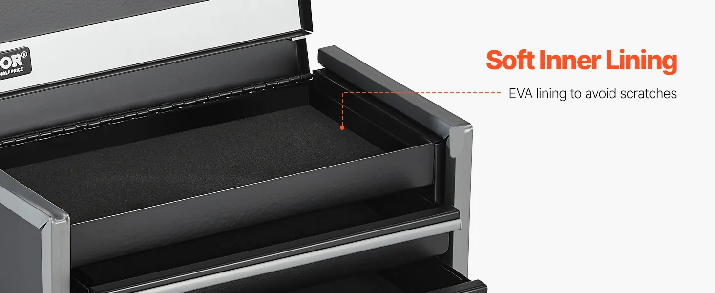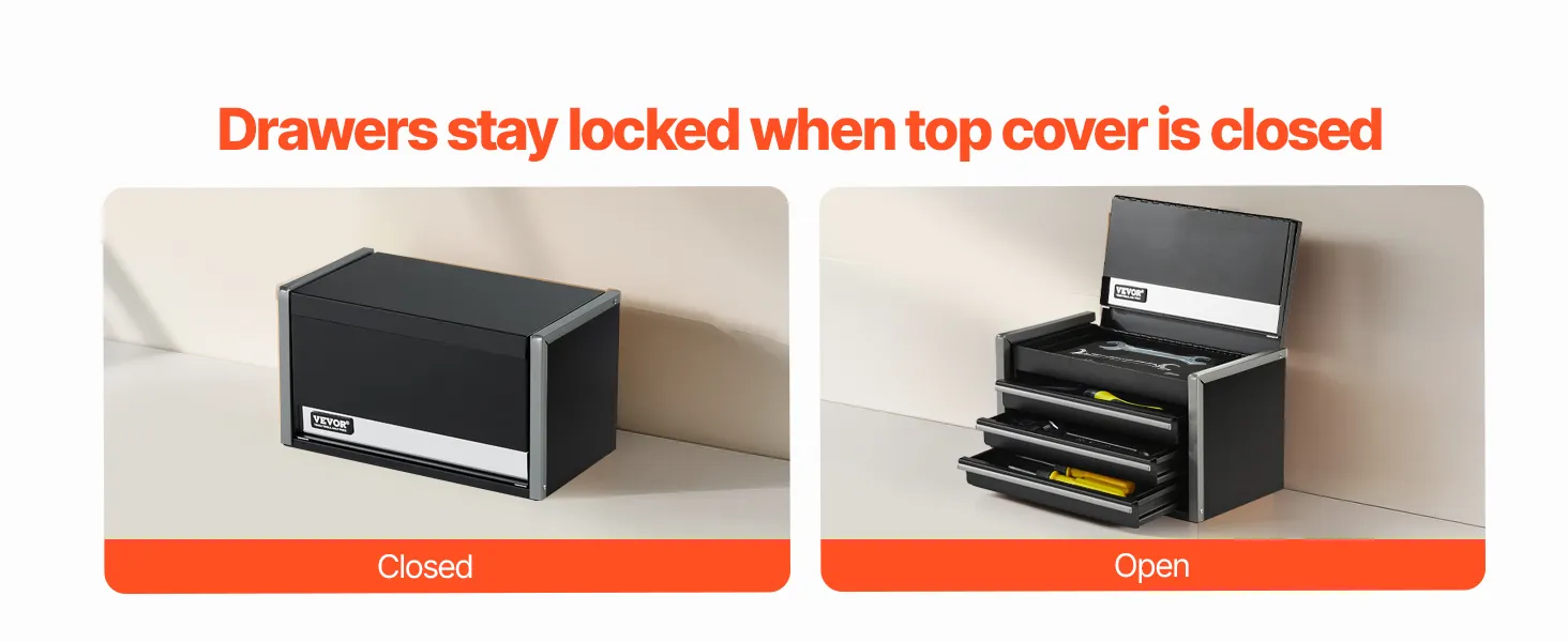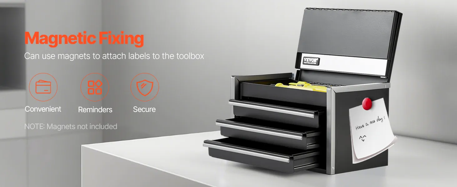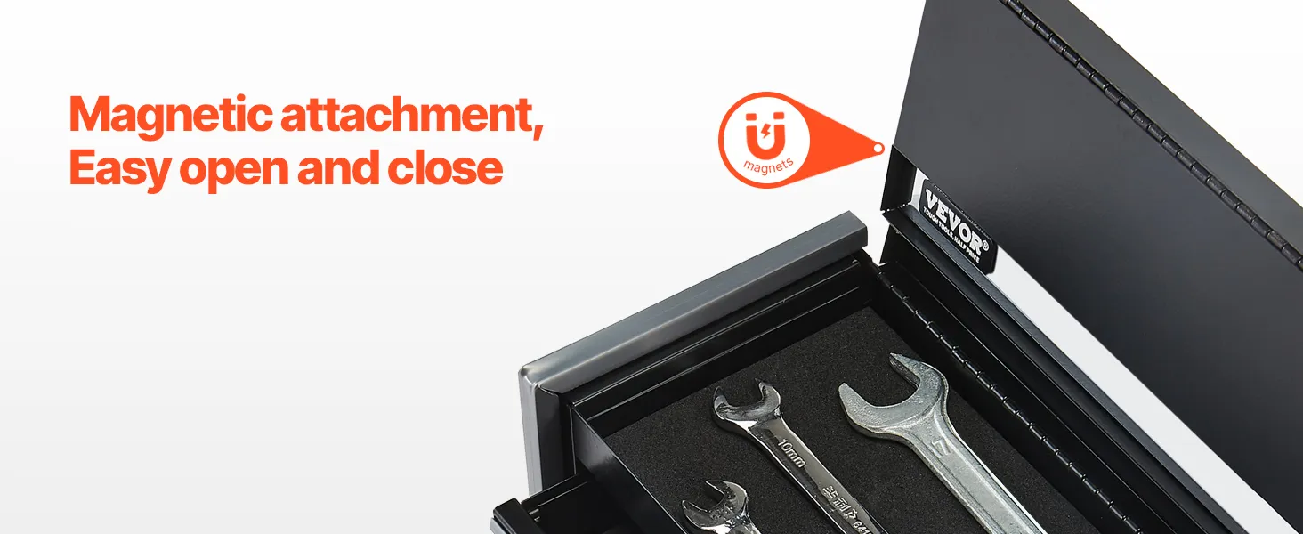 Oceľový box na náradie je navrhnutý s magnetickým horným krytom na jednoduché otváranie a zatváranie. Po zatvorení zostanú zásuvky bezpečne na svojom mieste, čo uľahčuje premiestňovanie boxu na náradie na rôzne miesta.