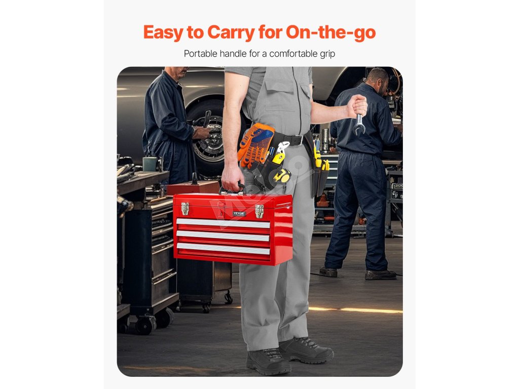 Pohodlná rukoväť na hornej strane uľahčuje prenášanie kovového boxu na náradie kamkoľvek potrebujete. Hladké zásuvky s guľôčkovými ložiskami zabezpečujú bezproblémové otváranie a zatváranie, čím sa skladovanie stáva potešením.