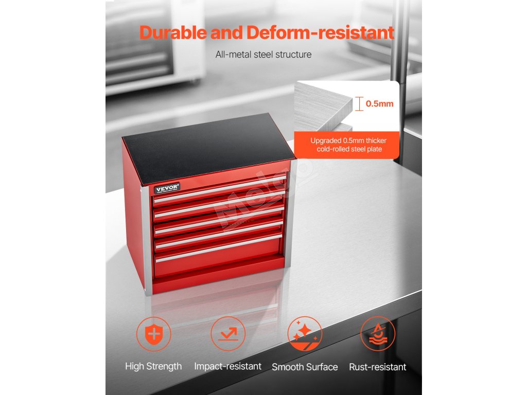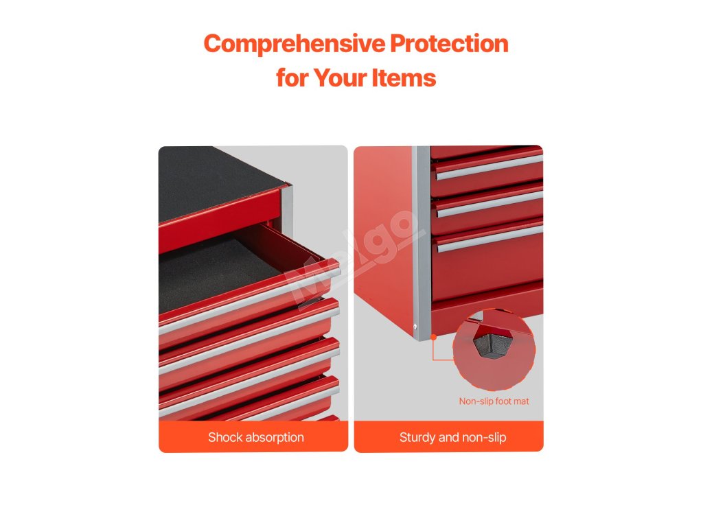 Celokovová konštrukcia zaručuje, že sa oceľový box na náradie ľahko nedeformuje ani nezlomí. Hladký chod zásuviek a protišmykový bezpečnostný mechanizmus účinne zabezpečia vaše predmety.