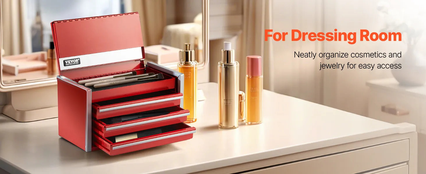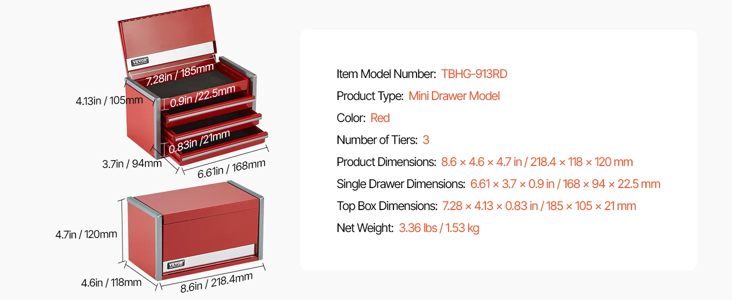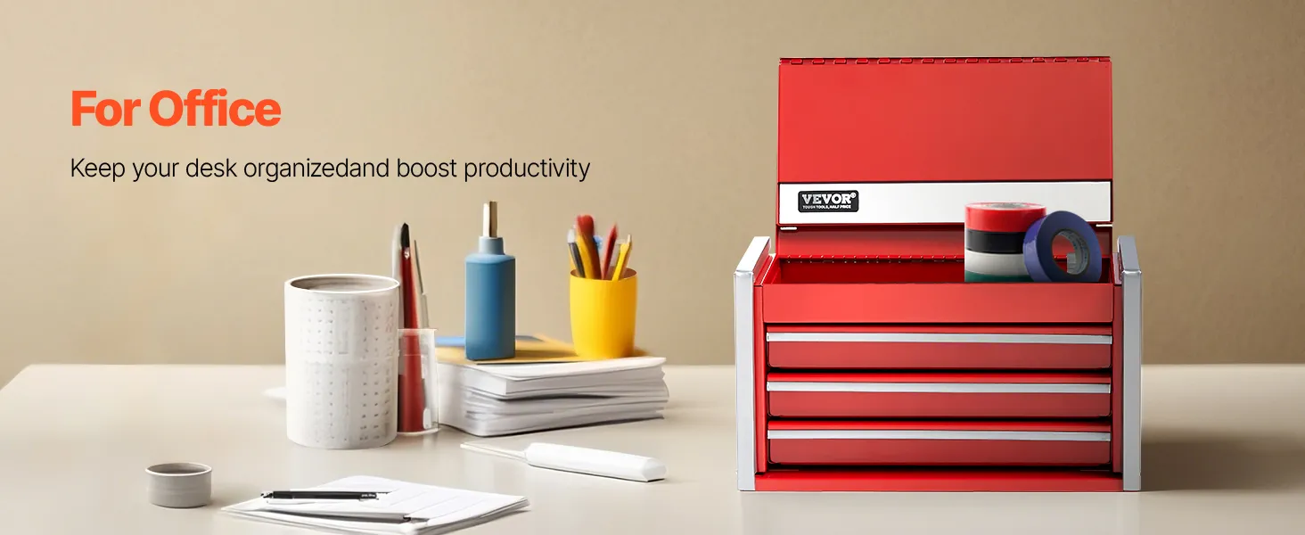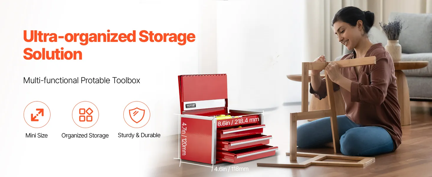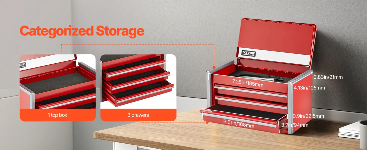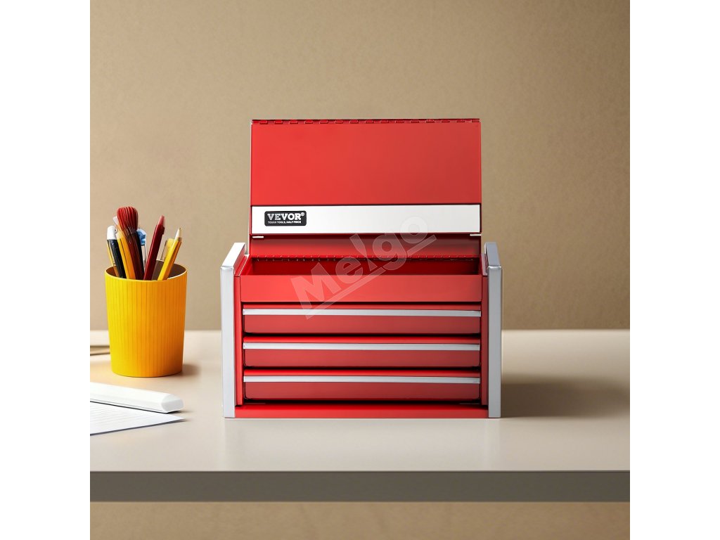 Mini kovový box na náradie obsahuje 1 hornú priehradku a 3 zásuvky, ktoré vám umožnia prehľadne kategorizovať predmety a udržiavať váš stôl uprataný a bez neporiadku.