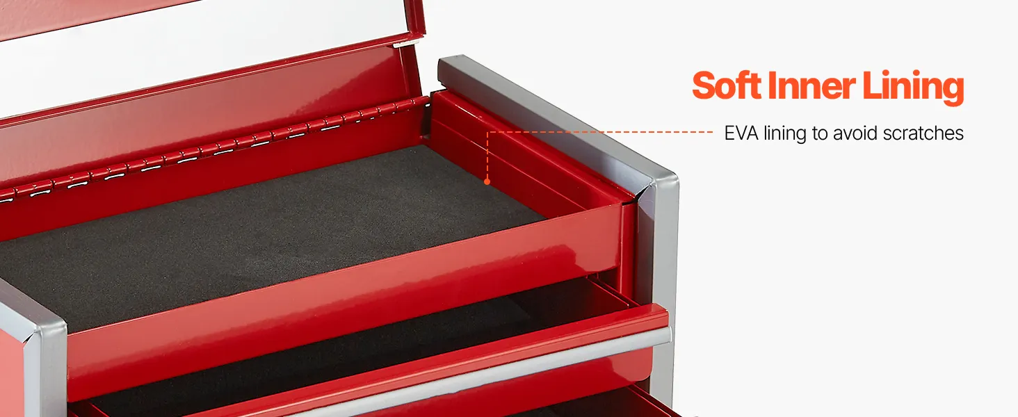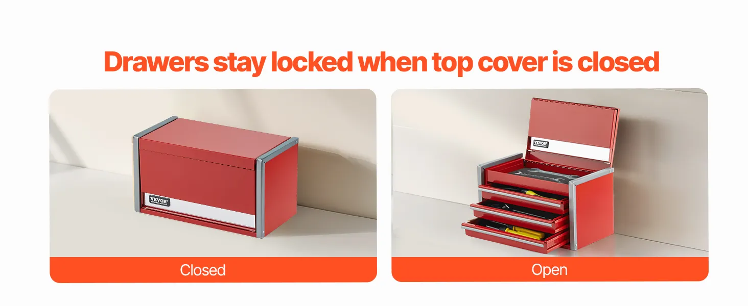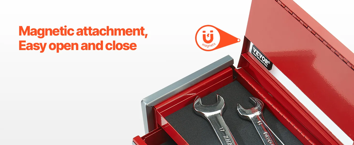 Oceľový box na náradie je navrhnutý s magnetickým horným krytom na jednoduché otváranie a zatváranie. Po zatvorení zostanú zásuvky bezpečne na svojom mieste, čo uľahčuje premiestňovanie boxu na náradie na rôzne miesta.