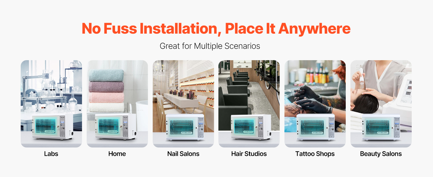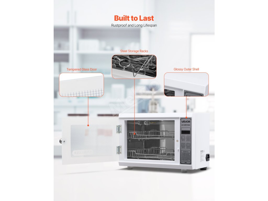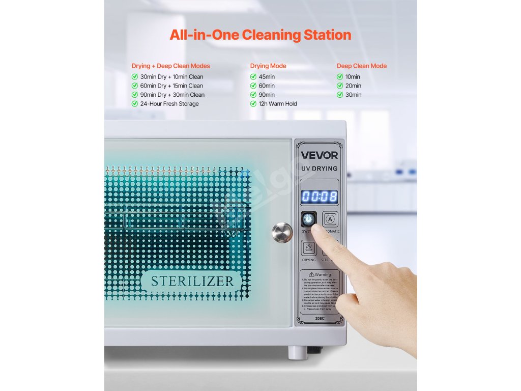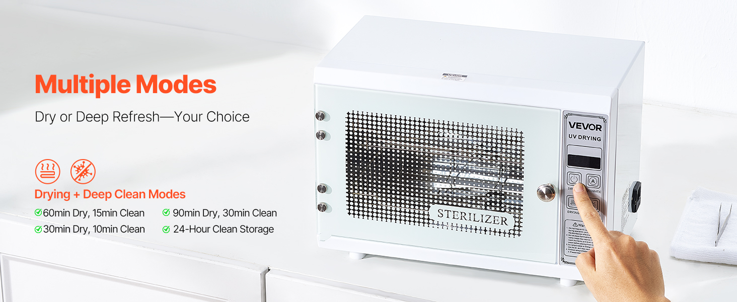 Táto skrinka na čistenie salónnych nástrojov poskytuje rôzne režimy, ktoré vyhovujú vašim potrebám: 60 minút ohrievania + 15 minút čistenia, 90 minút ohrievania + 30 minút čistenia, 30 minút ohrievania + 10 minút čistenia a 24-hodinové sterilné skladovanie. Prepínajte medzi funkciami čistenia a sušenia podľa potreby.