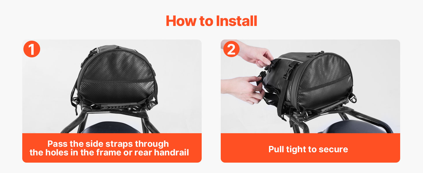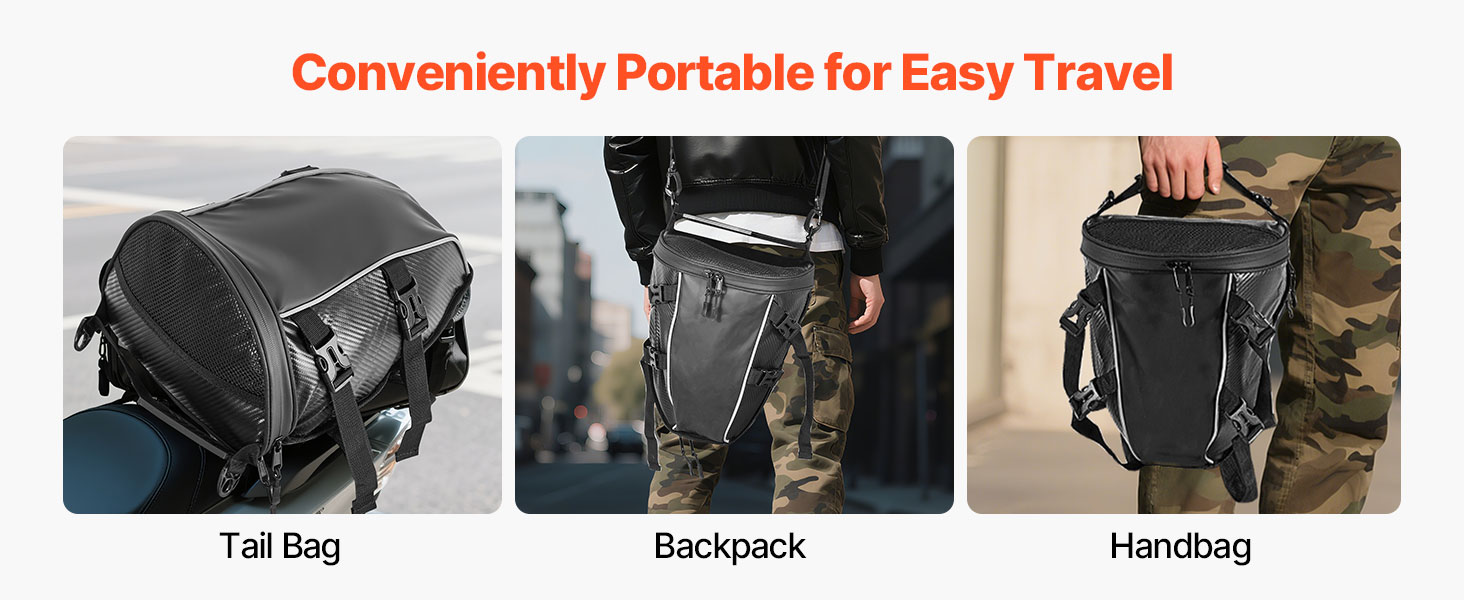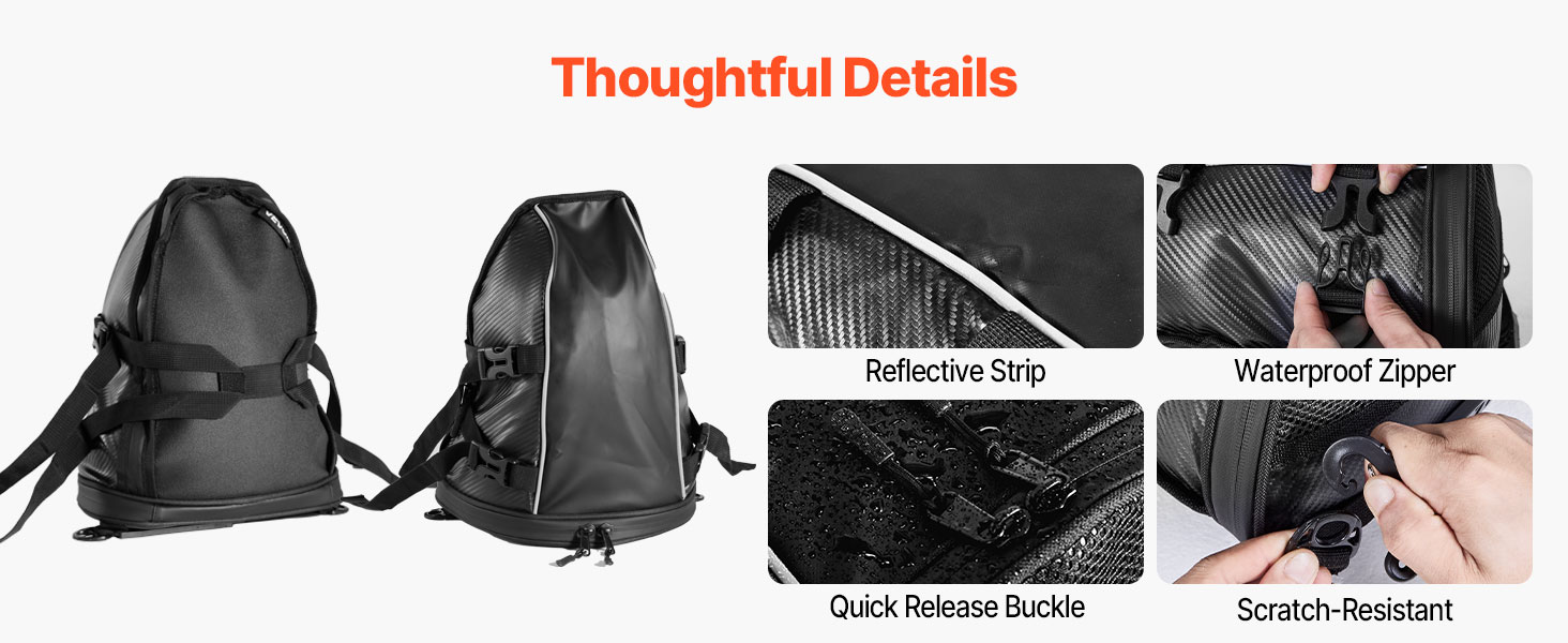 Hladký vodotesný zips a odolná tkanina odolná proti striekajúcej vode a opotrebovaniu zvyšujú celkový používateľský zážitok z tašky na sedadlo motocykla.