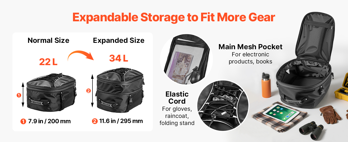 Motocyklový zadný vak 22–34 L rozšíriteľný, nepremokavý s popruhmi