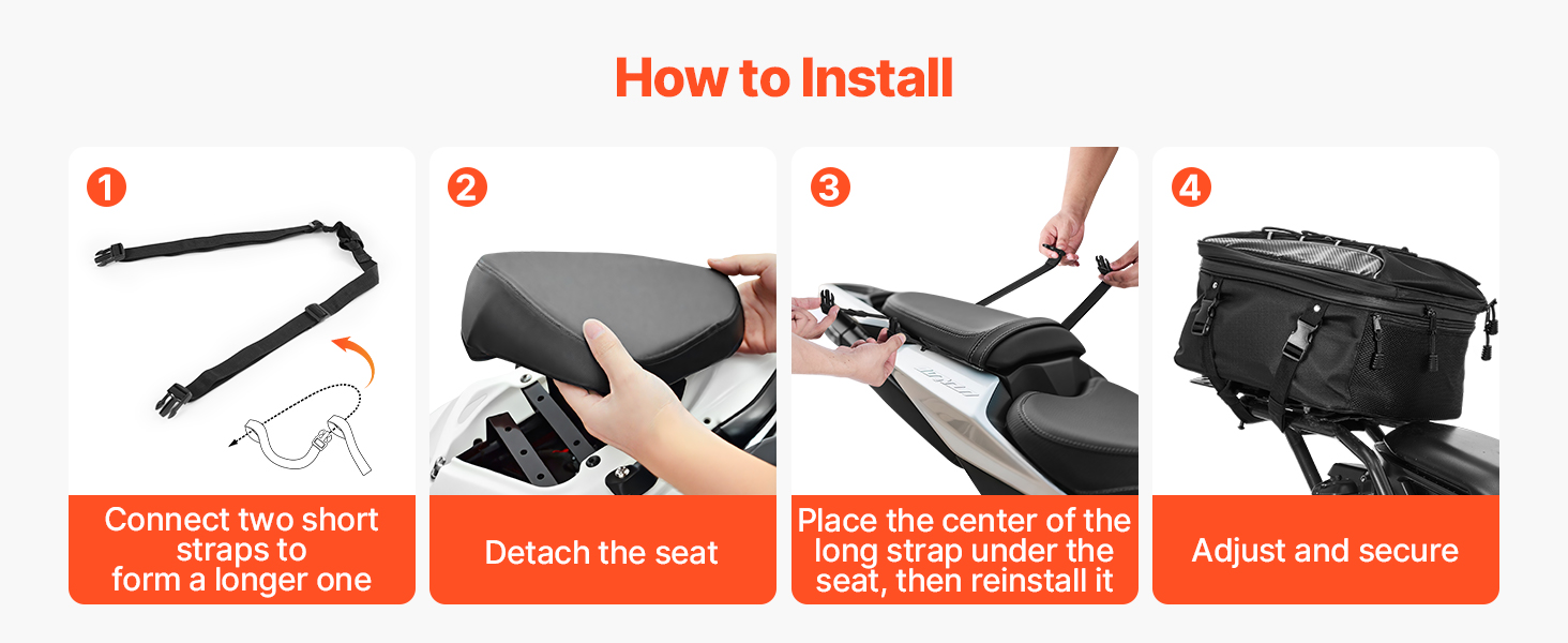 Všestranná taška na sedadlo motocykla sa rýchlo odpojí na jednoduché prenášanie a bezpečné uloženie. Je ideálna na krátke cesty alebo časté zastávky.