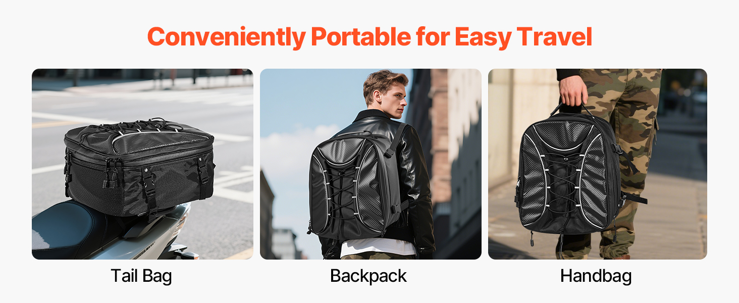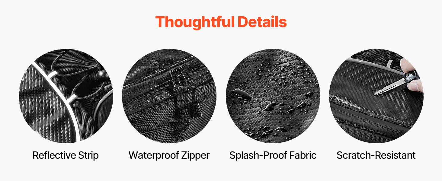 Hladký vodotesný zips a odolná tkanina odolná proti striekajúcej vode a opotrebovaniu zvyšujú celkový používateľský zážitok z tašky na motocykel.