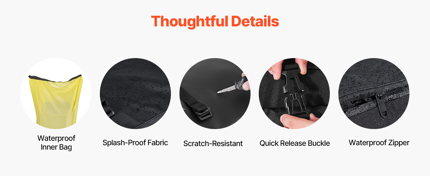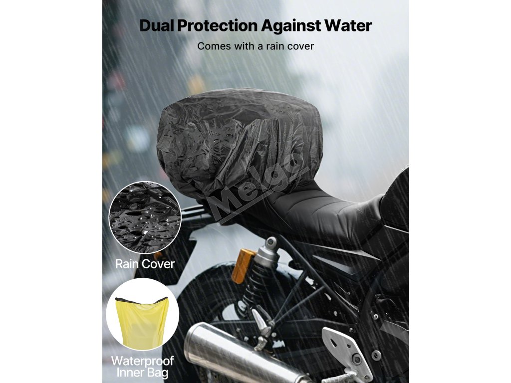 Hladký vodotesný zips a odolná tkanina odolná proti striekajúcej vode a opotrebovaniu zvyšujú celkový používateľský zážitok z tašky na sedadlo motocykla.