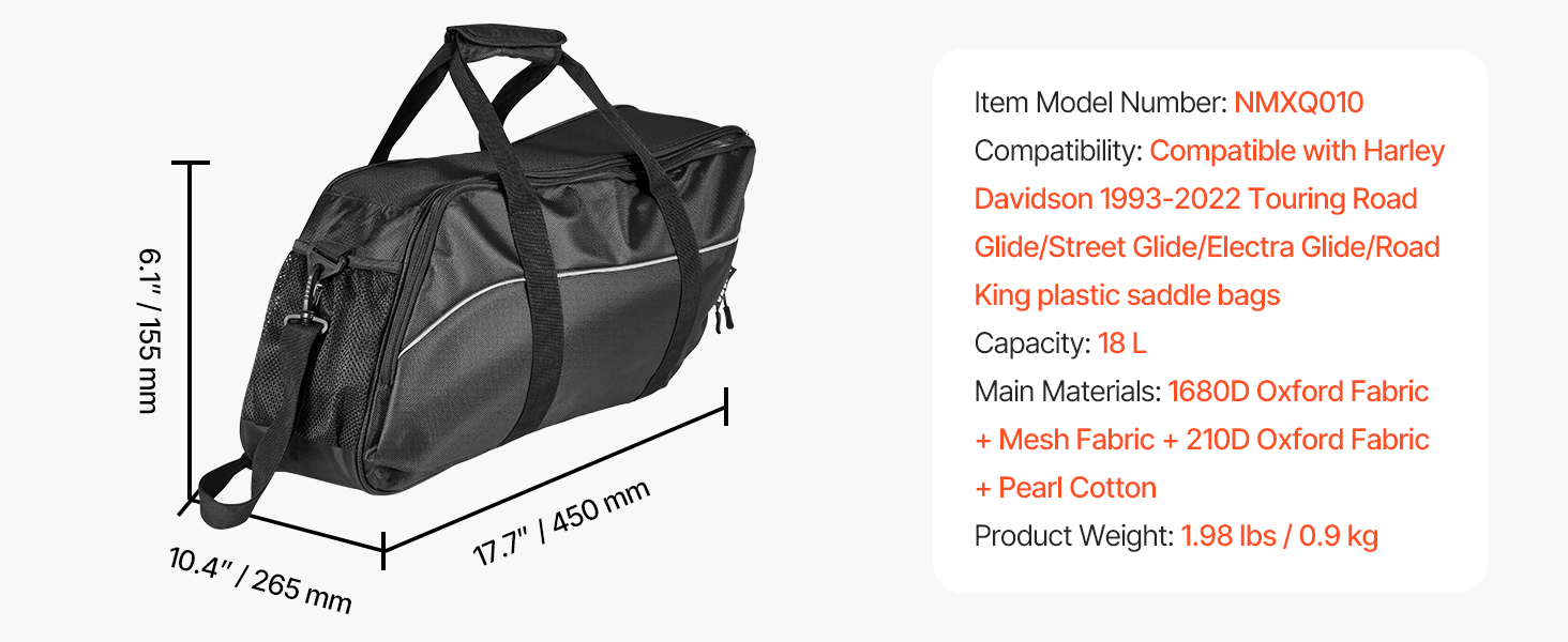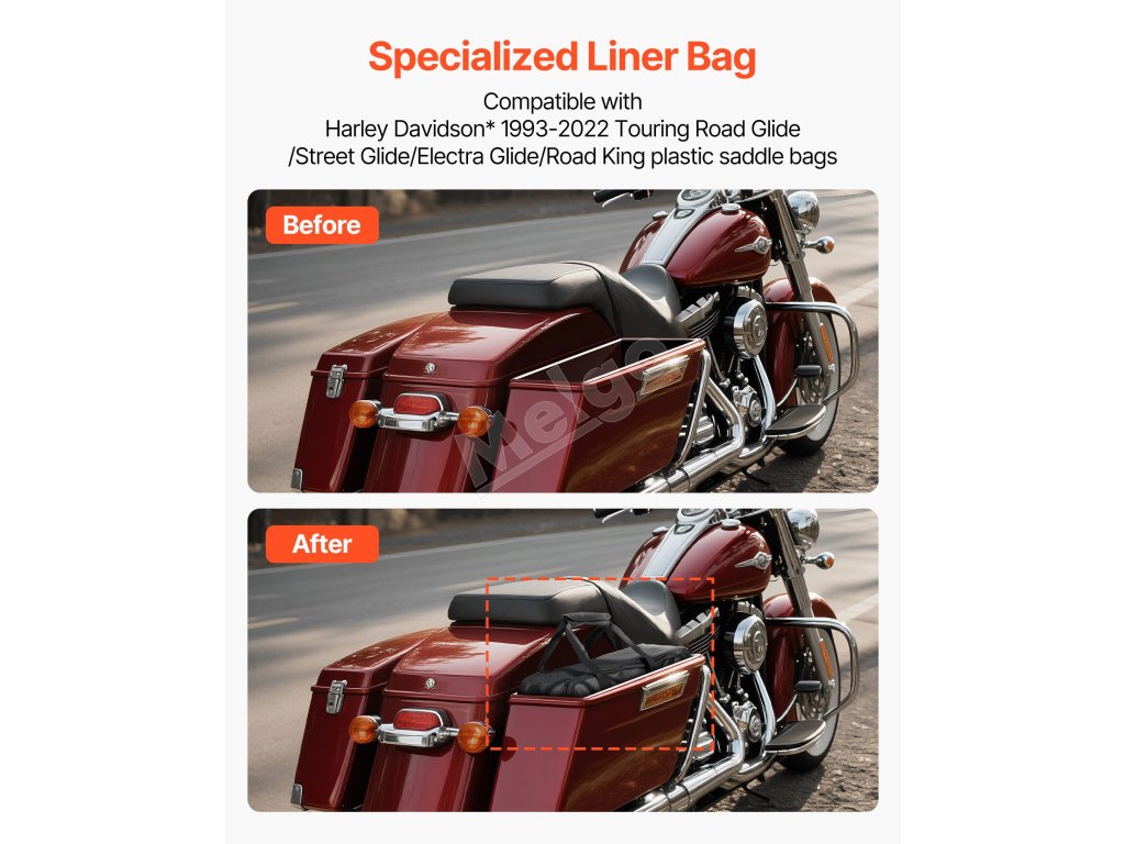 Táto taška s vložkou do sedlovej brašne motocykla je navrhnutá tak, aby maximalizovala priestor v sedlovej brašni a poskytovala ľahký prístup. Je kompatibilná s plastovými sedlovými brašnami Harley Davidson 1993-2022 Touring Road Glide, Street Glide, Electra Glide a Road King.
