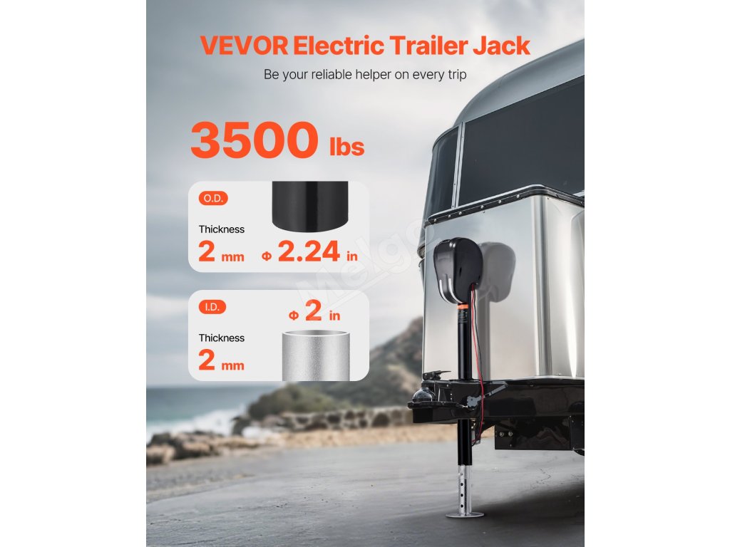 Elektrický zdvihák VEVOR má nosnosť 3500 kg a rozsah zdvihu od 9,5" do 30". Je vybavený 68,9" dlhým napájacím káblom. O.D.: 2,24", I.D.: 2".