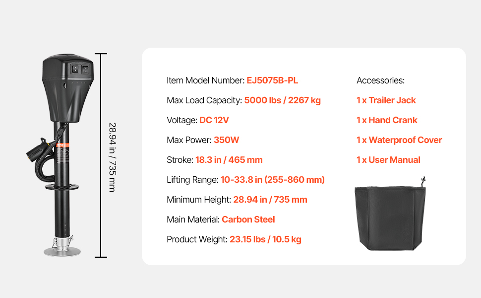 Elektrický zdvihák jazyka prívesu sa dodáva v zosilnenom štandardnom balení, aby sa predišlo poškodeniu počas prepravy. Jeho súčasťou je nepremokavý kryt so slnečnou clonou, ktorý zabezpečuje proti vode a UV žiareniu, s vodotesnou konštrukciou, aby odolal vonkajším vplyvom.