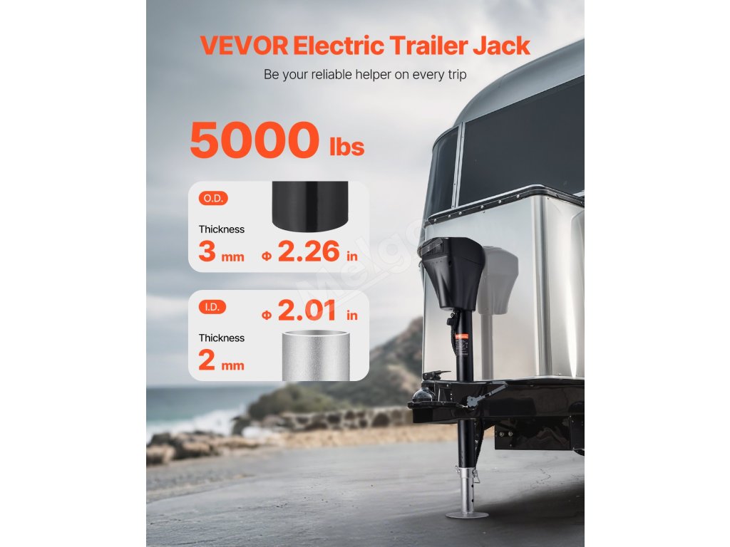 Elektrický zdvihák VEVOR má nosnosť 5000 lbs a rozsah zdvihu od 10" do 33,8". Je vybavený 68,9" dlhým napájacím káblom. O.D.: 2,26", I.D.: 2,01".