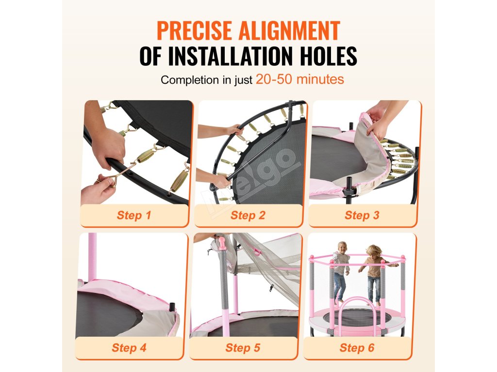 Na zostavenie trampolíny pre batoľatá je potrebná len jedna dospelá osoba. Podľa návodu zostavte rám, utiahnite nohy a pripevnite podložku k rámu na skákanie. Montážne otvory a závity sú presne prispôsobené na inštaláciu v jednom kroku.