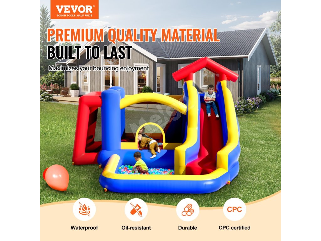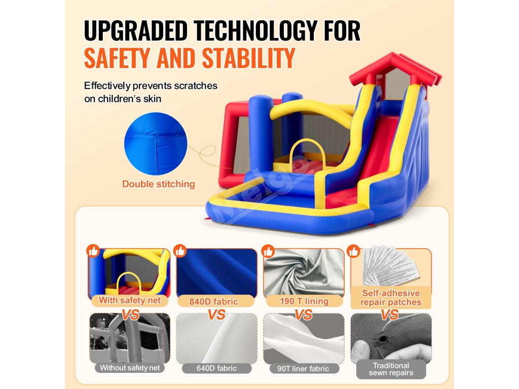 Skákací hrad používa podšívku 190T + látku 840D oxford pre zvýšenú odolnosť. Nosníky a spoje využívajú technológiu dvojitého šitia, aby sa zabránilo poškriabaniu detskej pokožky, a to aj v šortkách. Bezpečnostná sieť maximalizuje vetranie a zabraňuje pádu detí na zem zo strán.