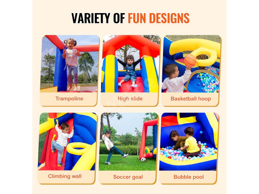Tento rodinný skákací hrad na záhrade, ktorý je vybavený plochami na skákanie, šmykľavkami, bublinkovými bazénmi, futbalovými bránkami, lezeckými stenami a ďalšími prvkami, ponúka vysokú hravosť a poskytuje rôzne možnosti zábavy a zbližovania rodiny.